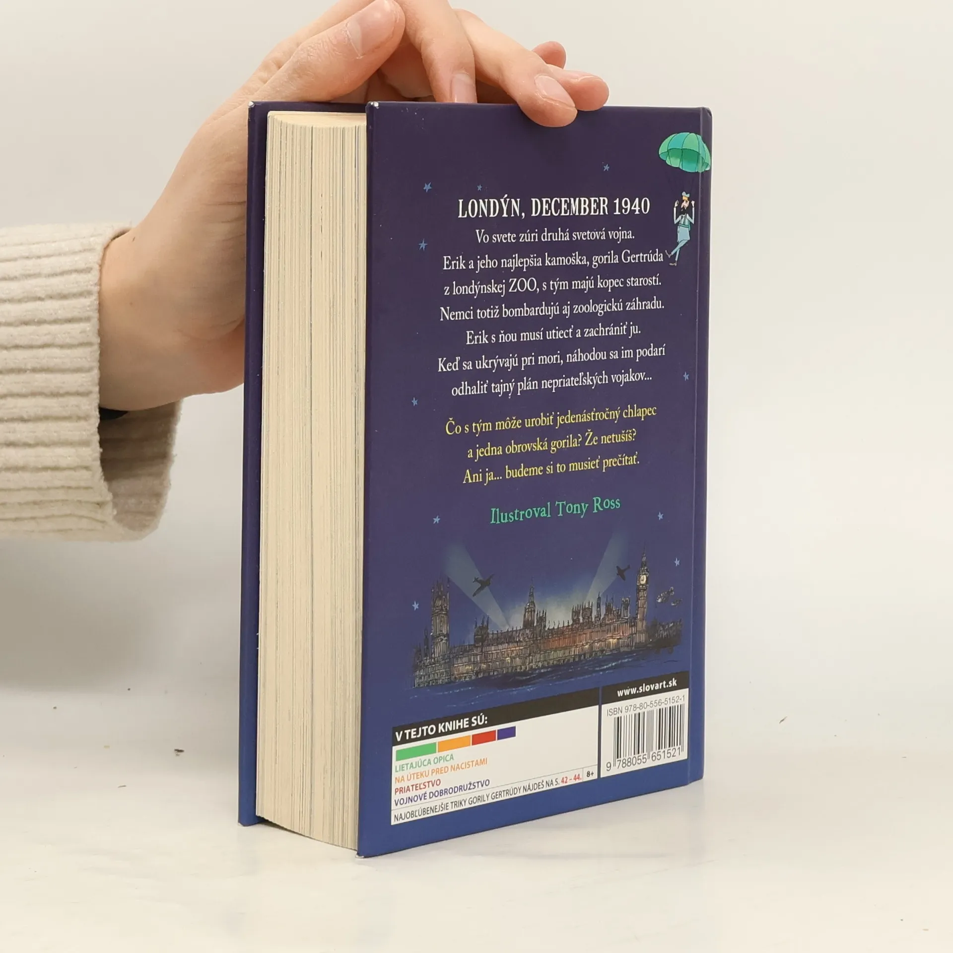 Ďalšia kniha od svetoznámeho britského komika a autora detských bestsellerov Davida Walliamsa je príbehom chlapca, ktorý má ozajstný problém.Musí pred bombardovaním počas druhej svetovej vojny zachrániť opice. Ako to? V roku 1940 je totiž Veľká Británia vo vojne s nacistickým Nemeckom. Jedenásťročný Erik trávi najviac času v londýnskej zoo, kde žije zviera, ktoré je preňho veľmi dôležité - gorila Getrúda. Erik ju chce ochrániť pred bombovými útokmi, a tak sa so svojím strýkom Sidom, ošetrovateľom v zoo, rozhodne s Gertrúdou utiecť. Ukrývajú sa pri mori a úplnou náhodou sa im podarí odhaliť tajný plán nepriateľských vojakov...
