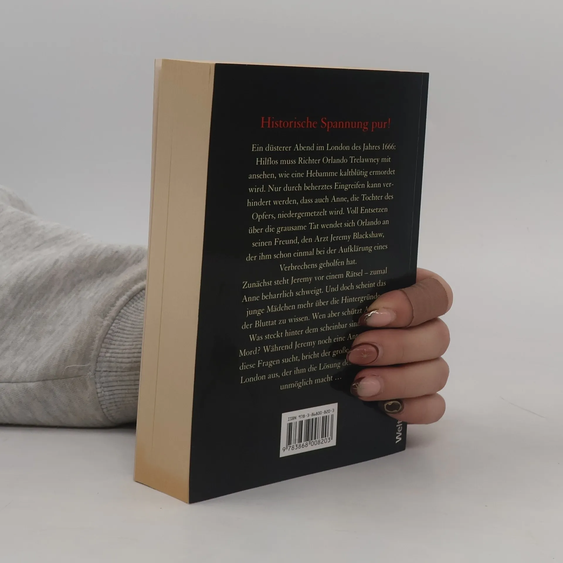 Ein düsterer Abend im London des Jahres 1666: Hilflos muss Richter Orlando Trelawney mit ansehen, wie eine Hebamme kaltblütig ermordet wird. Nur durch beherztes Eingreifen kann verhindert werden, dass auch Anne, die Tochter des Opfers, niedergemetzelt wird. Voll Entsetzen über die grausame Tat wendet sich Orlando an seinen Freund, den Arzt Jeremy Blackshaw, der ihm schon einmal bei der Aufklärung eines Verbrechens geholfen hat. Zunächst steht Jeremy vor einem Rätsel – zumal Anne beharrlich schweigt. Und doch scheint das junge Mädchen mehr über die Hintergründe der Bluttat zu wissen. Wen aber schützt Anne? Was steckt hinter dem scheinbar sinnlosen Mord? Während Jeremy noch eine Antwort auf diese Fragen sucht, bricht der große Brand von London aus, der ihm die Lösung des Falls fast unmöglich macht …