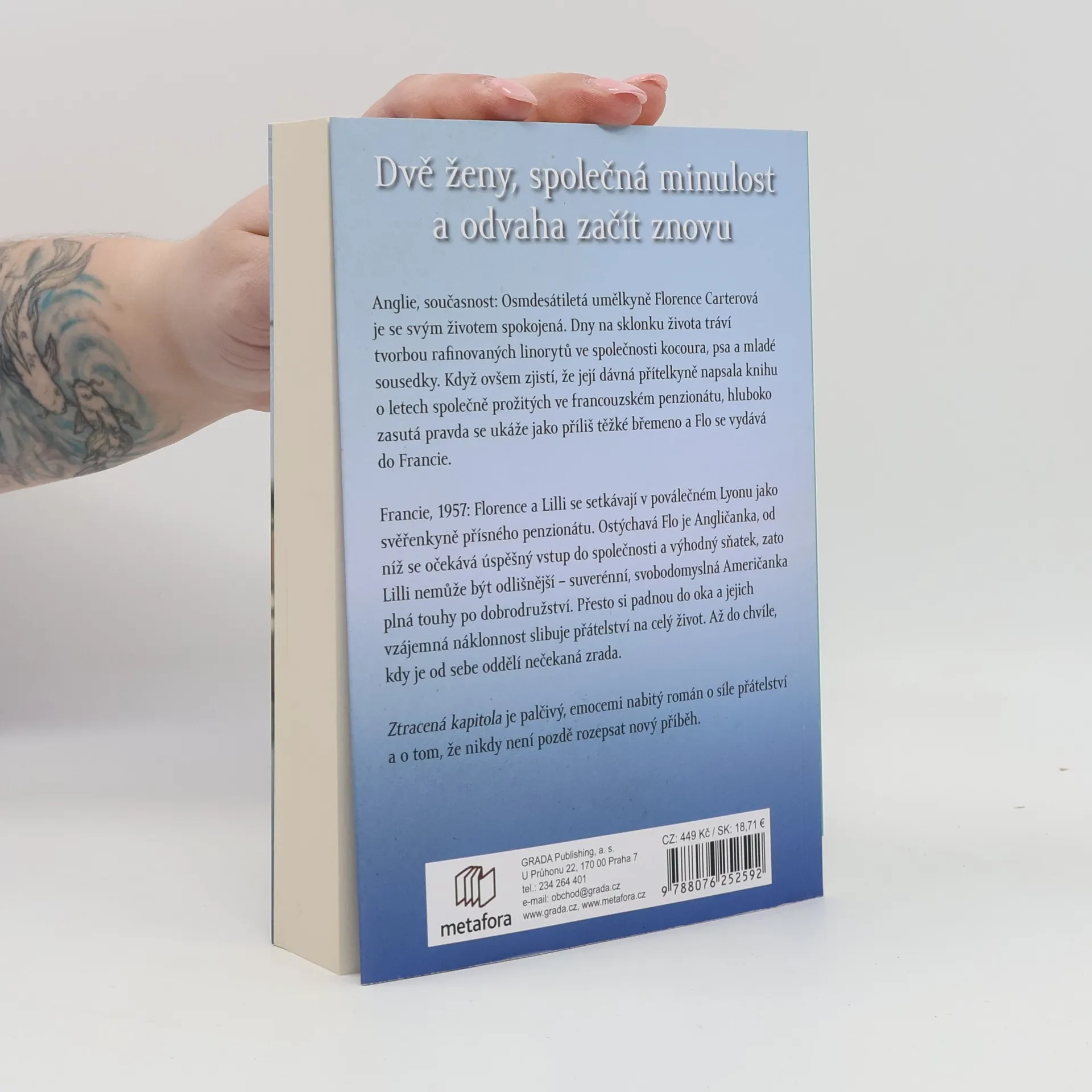Anglie, současnost: Osmdesátiletá umělkyně Florence Carterová je se svým životem spokojená. Dny na sklonku života tráví tvorbou rafinovaných linorytů ve společnosti kocoura, psa a mladé sousedky Alice, tiché a úzkostné dívky. Když ovšem Flo zjistí, že její dávná ztracená přítelkyně vydala knihu o letech společně prožitých ve francouzském penzionátu, cítí povinnost odhalit roušku tajemství z minulosti a vydává se v doprovodu Alice a její matky do Francie. Po příjezdu do Lyonu se však hluboko zasutá pravda ukáže jako příliš těžké břemeno. Francie 1957: Florence a Lili se setkávají v poválečném Lyonu jako svěřenkyně přísně vedeného penzionátu pro dívky. Flo je ostýchavé děvče z Anglie, od něhož se očekává úspěšný vstup do společnosti a pak i výhodný sňatek. Lili je její pravý opak – suverénní Američanka se svobodnou duší, plná touhy po dobrodružství. Navzdory všemu se z dívek stanou nerozlučné kamarádky, jejichž vzájemná náklonnost slibuje přátelství na celý život… než je od sebe oddělí nečekaná zrada. Ztracená kapitola je palčivý, emocemi nabitý román o síle přátelství. Jeho poselstvím je zpráva, že nikdy není pozdě rozepsat nový příběh.