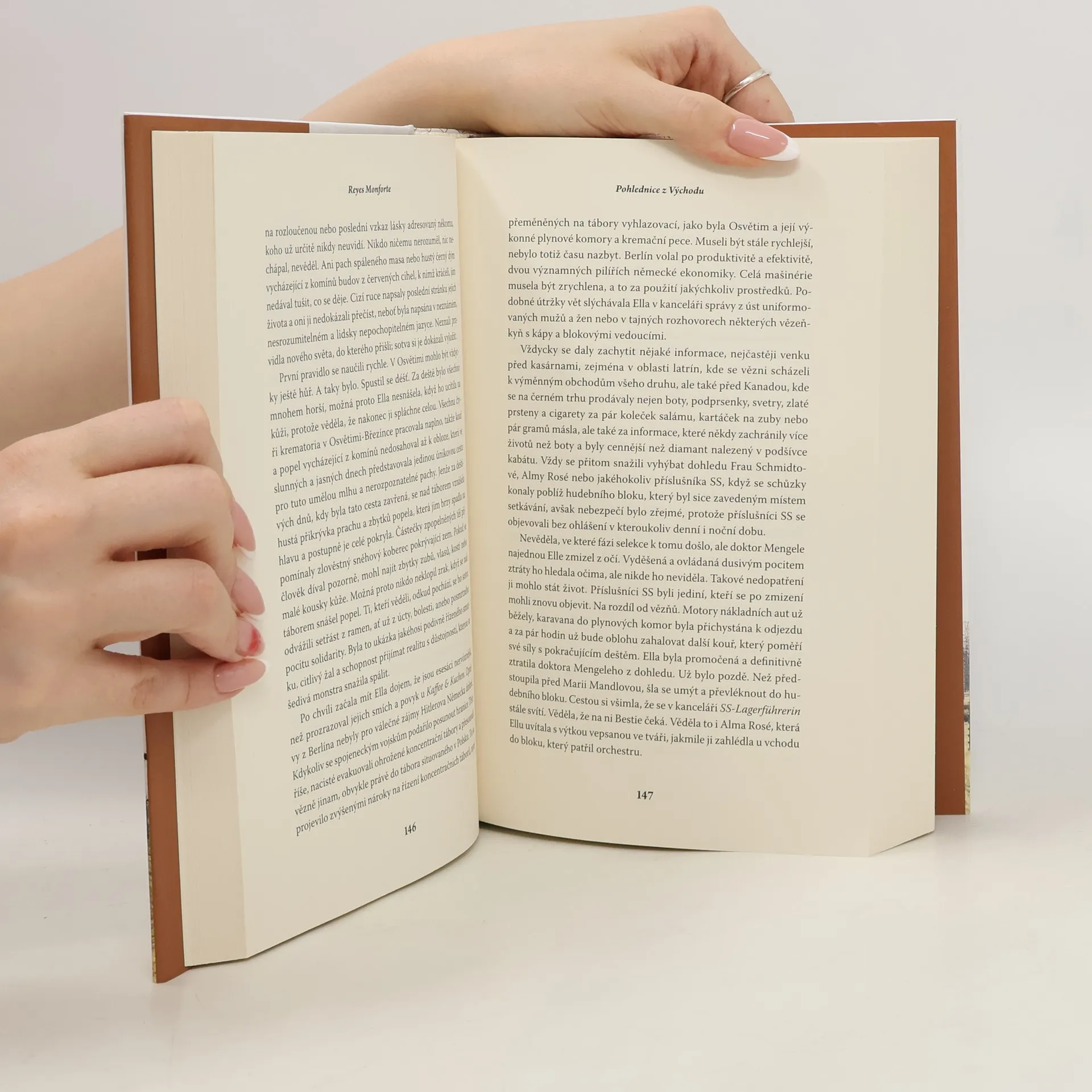 V září 1943 mladá Francouzka jménem Ella dorazí v transportu do koncentračního tábora v Osvětimi. Velitelka tábora, krvelačná esesačka Maria Mandlová, které místní vězni přezdívají Bestie, si všimne Ellina dokonalého rukopisu, a proto ji okamžitě přiřadí na pozici kopistky v táborovém ženském orchestru.O něco později Ella díky své znalosti jazyků začne pracovat v bloku Kanada, kde v zavazadlech zplynovaných spoluvězňů nachází množství pohlednic a fotografií, což ji přivede k rozhodnutí zapsat příběh každého takového člověka a uchovat tak jeho památku.Zatímco v táboře navazuje cenná přátelství a snaží se přežít zlomyslnost svých věznitelů, vypukne mezi vězni vzpoura, která ji i muže, kterého miluje, přivede na samotný práh života a smrti.O čtyřicet let později dostane mladá Bella krabici plnou pohlednic. „Toto jsou pohlednice, které psala tvoje matka, když byla na Východě, proto jim říkala pohlednice z Východu. Chtěla, abys je měla a hlavně, aby sis je přečetla, a to v pravý čas. A ten nastal právě teď.“Reyes Monforte skvěle kombinuje fikci s příběhy reálných historických postav. Na stránkách románu Pohlednice z Východu se proto setkáme s některými z nejbestiálnějších nacistů jako Josef Mengele, Heinrich Himmler či Maria Mandlová.