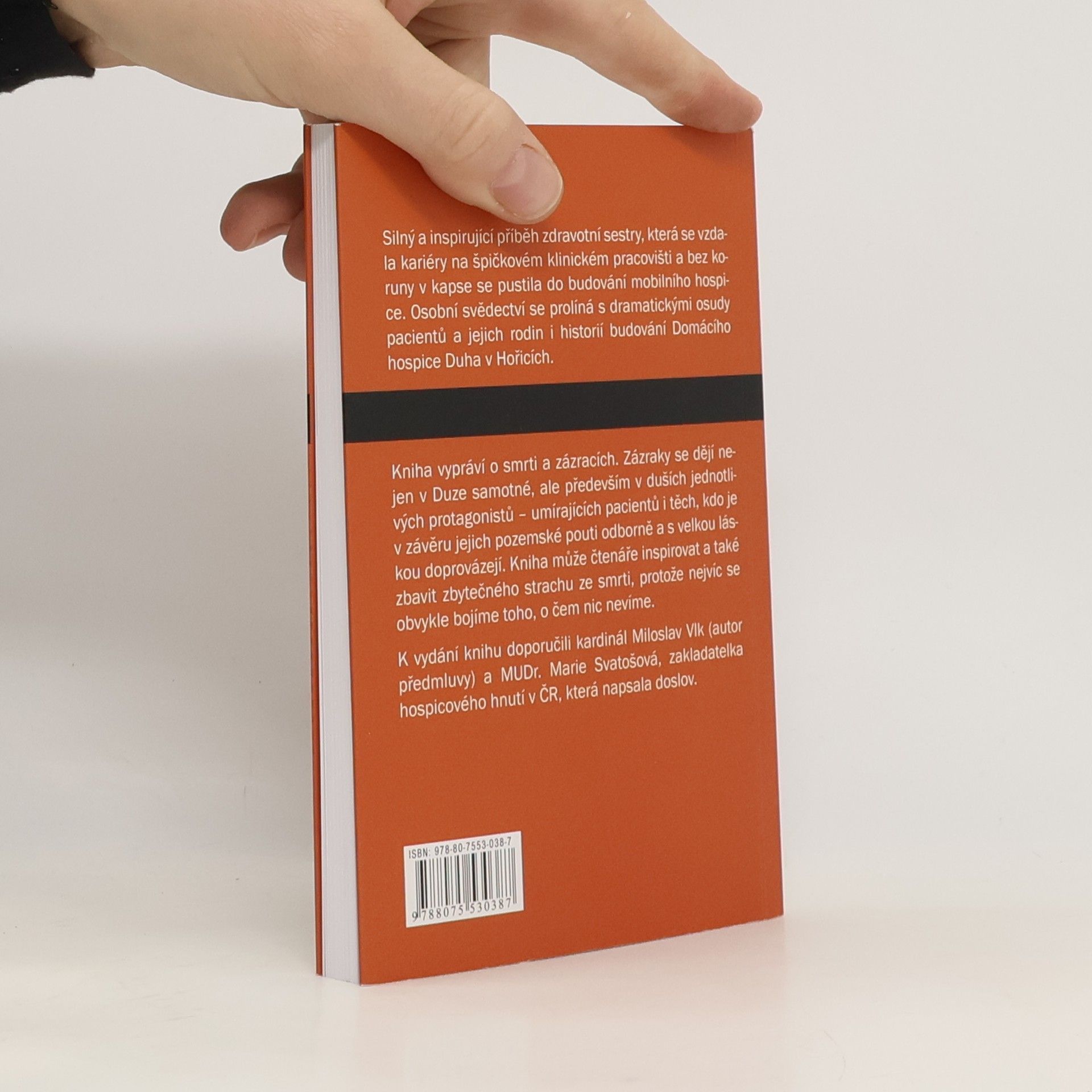 Silný a inspirující příběh zdravotní sestry, která se vzdala kariéry na špičkovém klinickém pracovišti a bez koruny v kapse se pustila do budování mobilního hospice. Osobní svědectví se prolíná s dramatickými osudy pacientů a jejich rodin i historií budování Domácího hospice Duha v Hořicích. Kniha vypráví o smrti a zázracích. Zázraky se dějí nejen v Duze samotné, ale především v duších jednotlivých protagonistů – umírajících pacientů i těch, kdo je v závěru jejich pozemské pouti odborně a s velkou láskou doprovázejí. Kniha může čtenáře inspirovat a také zbavit zbytečného strachu ze smrti, protože nejvíc se obvykle bojíme toho, o čem nic nevíme. K vydání knihu doporučili kardinál Miloslav Vlk (autor předmluvy) a MUDr. Marie Svatošová, zakladatelka hospicového hnutí v ČR, která napsala doslov.