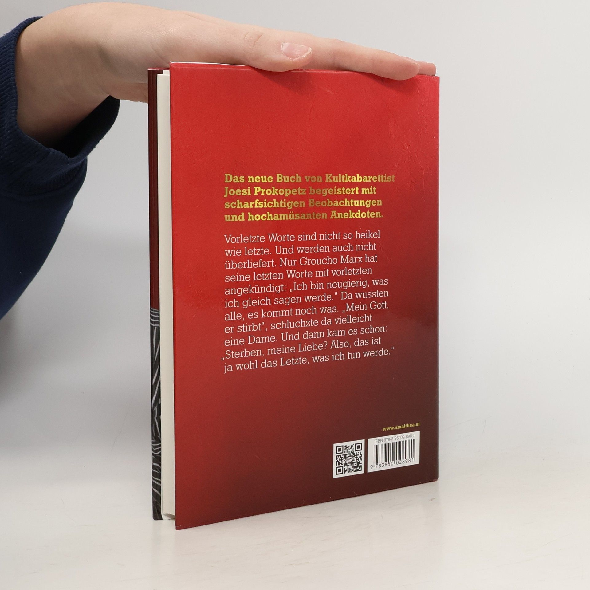 Vorletzte Worte?" - „Ja" - „Warum denn vorletzte?" - „Das letzte Wort hat immer meine Frau." Joesi Prokopetz spannt den Bogen von feuilletonistischen Betrachtungen über (vor-)letzte Worte, erschütternden Enthüllungen über Entfernung von Speiseresten aus Zahnersatz, das Leben als Pavian, das Verlorensein in Baumärkten, stellt sich und uns die Gewissensfrage: „Sind Sie bestechlich?" Er fragt sich: „Wo ist mein Hirn, wenn ich online bin?" und enttarnt Facebook als tumben, inneren Monolog der vernetzten Welt, erkennt Tracht als verfilzten Stoff der Heimat und verzweifelt am vergeblichen Warten auf Siegfried den Trachtentöter. Vorletzte Worte sind nicht so heikel wie letzte. Und werden auch nicht überliefert. Nur Groucho Marx hat seine letzten Worte mit vorletzten angekündigt: „Ich bin neugierig, was ich gleich sagen werden." Da wussten alle, es kommt noch was. Das neue Buch von Kultkabarettist Joesi Prokopetz begeistert mit scharfsichtigen Beobachtungen und hoch-amüsanten Anekdoten.