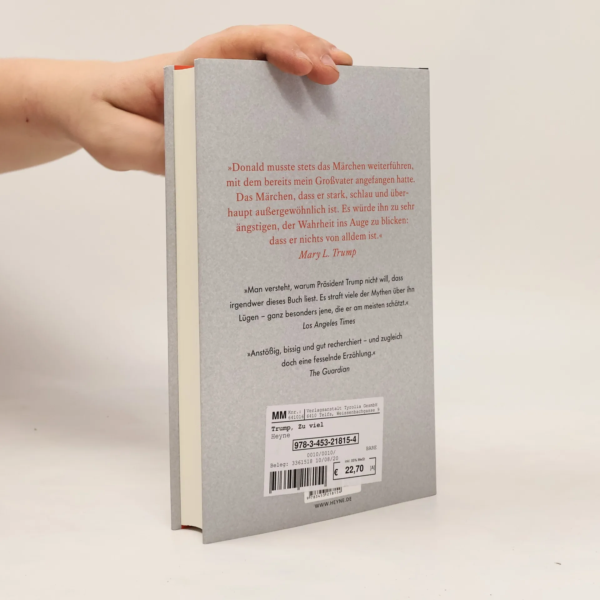 Das wahre Gesicht von Donald Trump – intime Details aus der Familiengeschichte des US-Präsidenten Mary L. Trump, Nichte des US-Präsidenten und promovierte klinische Psychologin, enthüllt die dunkle Seite der Familie Trump. Einen Großteil ihrer Kindheit verbrachte Mary im Hause ihrer Großeltern in New York, wo auch Donald und seine vier Geschwister aufwuchsen. Sie schildert, wie Donald Trump in einer Atmosphäre heranwuchs, die ihn für sein Leben zeichnete und ihn letztlich zu einer Bedrohung für das Wohlergehen und die Sicherheit der ganzen Welt machte.Als einziges Familienmitglied ist Mary Trump dazu bereit, aus eigener Anschauung die Wahrheit über eine der mächtigsten Familien der Welt zu erzählen. Ihre Insiderperspektive in Verbindung mit ihrer fachlichen Ausbildung ermöglicht einen absolut einmaligen Einblick in die Psyche des unberechenbarsten Mannes, der je an der Spitze einer Weltmacht stand. »Anstößig, bissig und gut recherchiert – und zugleich doch eine fesselnde Erzählung.« —The Guardian »Nach vielen, vielen Trump-Büchern ist dieses tatsächlich unentbehrlich.« — Vanity Fair