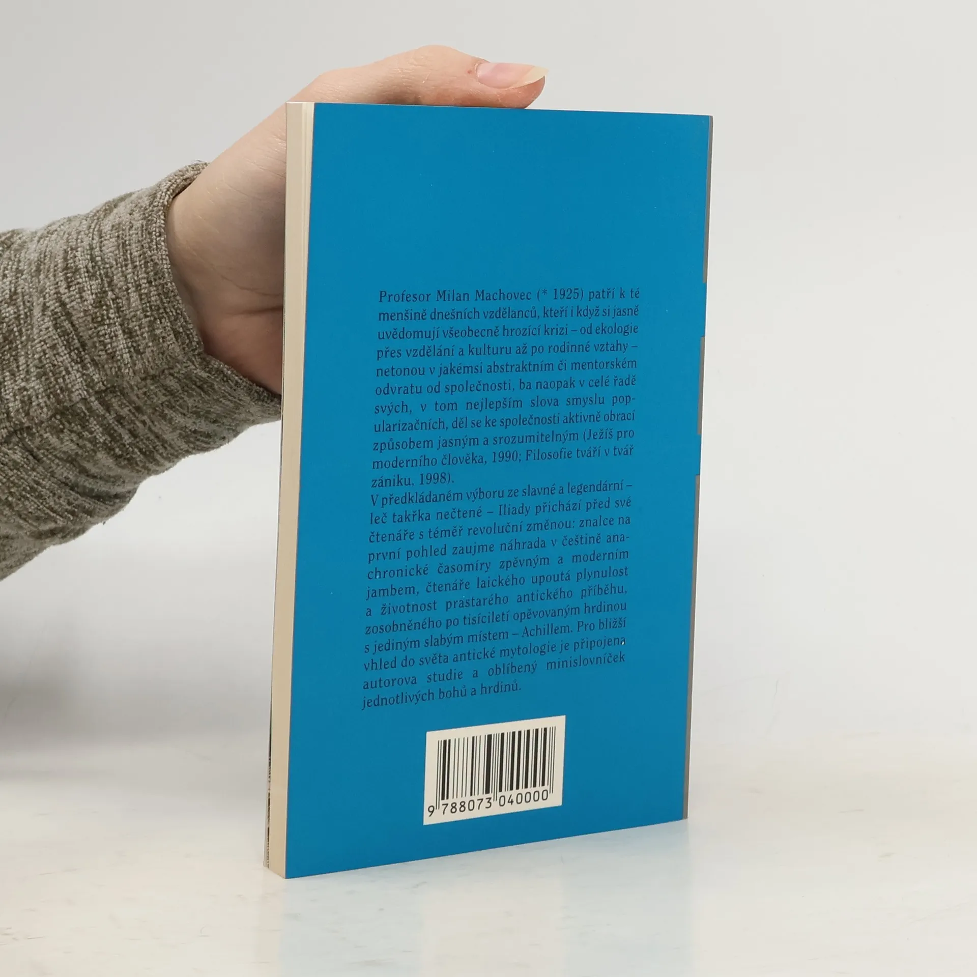 Volný překlad částí Homérovy Iliády, pojednávajících o Achillovi, doplňují kulturně-historická analýza významu antického hrdiny a psychoanalytický výklad řecké mytologie. Interdisciplinární text se pokouší vřadit antický příběh do širších ideových a kulturních souvislostí. Český filozof interpretuje klasický příběh řecké mytologie o Achillovi. Kniha vychází za podpory honorárního konzula ČR v Hamburku pana Roberta Vogela, zvláštní poděkování patří panu Karlu Trinkewitzovi. Pravopisná podoba cizích slov (zejména antických jmen) je ponechána v autorově znění.