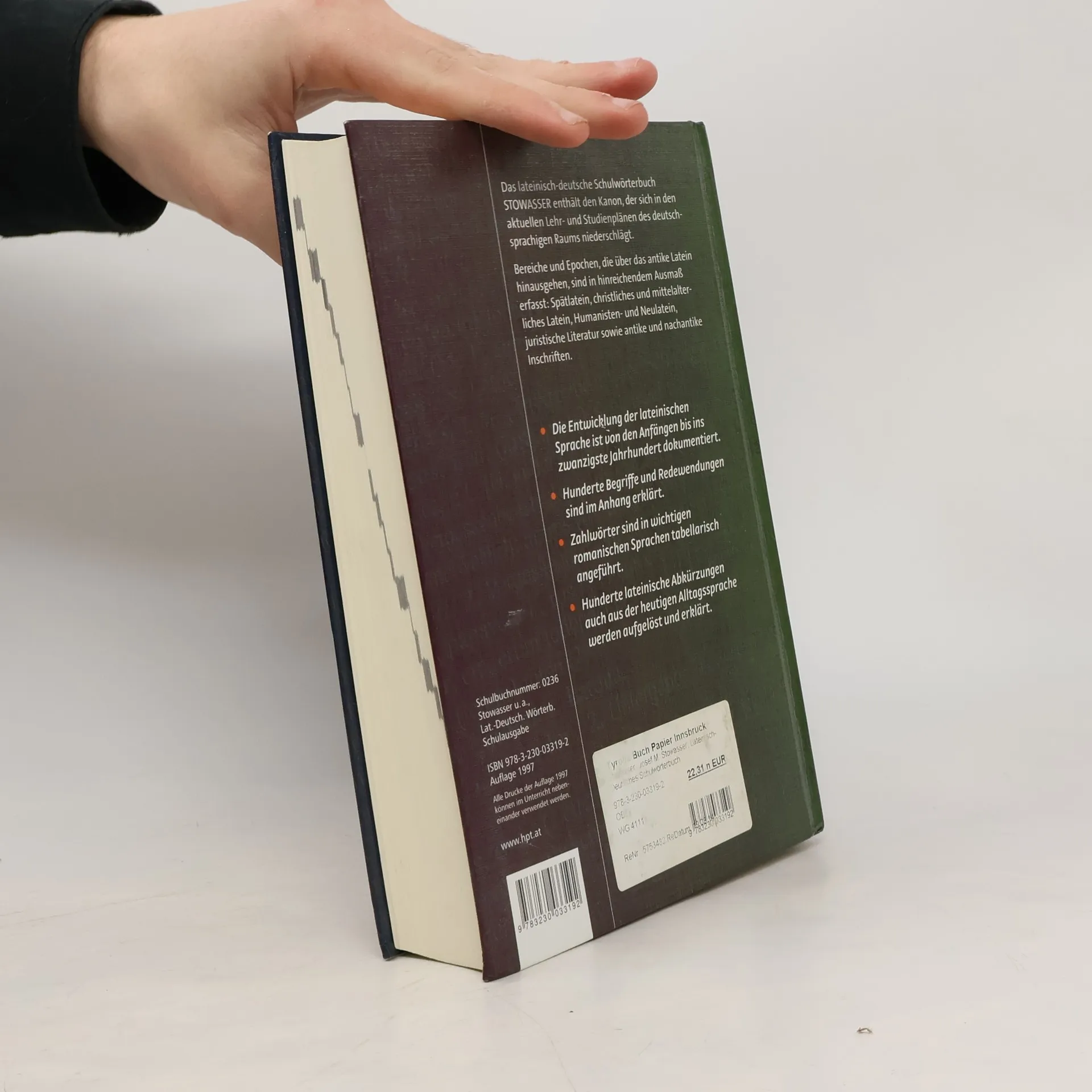 Das traditionsreiche lateinisch-deutsche Schulwörterbuch STOWASSER umfasst neben einem umfangreichen lexikalischen Teil eine Einführung in die Sprachgeschichte, eine Zusammenstellung gebräuchlicher lateinischer Begriffe und Redewendungen der Alltagssprache, ein Kapitel über Datumsangaben und Zeitrechnung in lateinischen Texten der Antike, des Mittelalters und der Neuzeit sowie eine Liste gängiger Abkürzungen lateinischer Wörter und Wendungen auf Inschriften und im Alltag. Der STOWASSER geht über den traditionellen Rahmen der Antike hinaus. Spätlatein, christliches und mittelalterliches Latein, Humanisten- und Neulatein, juristische Literatur sowie antike und nachantike Inschriften finden Beachtung. Somit ist durch die Texte, die im STOWASSER aufscheinen, römische bzw. lateinische Literatur aus über zwei Jahrtausenden vertreten.