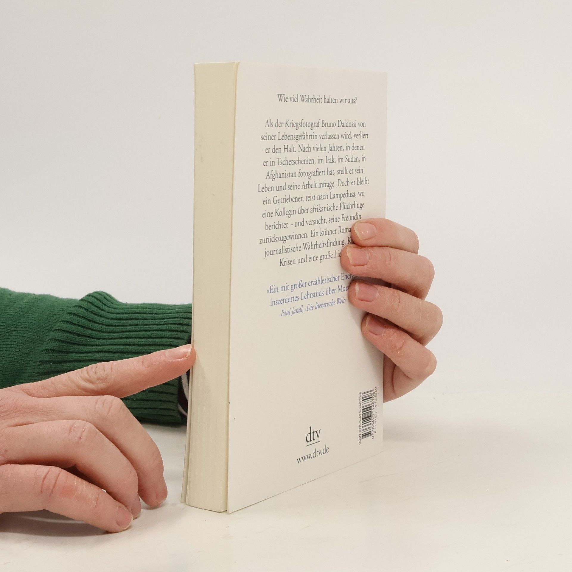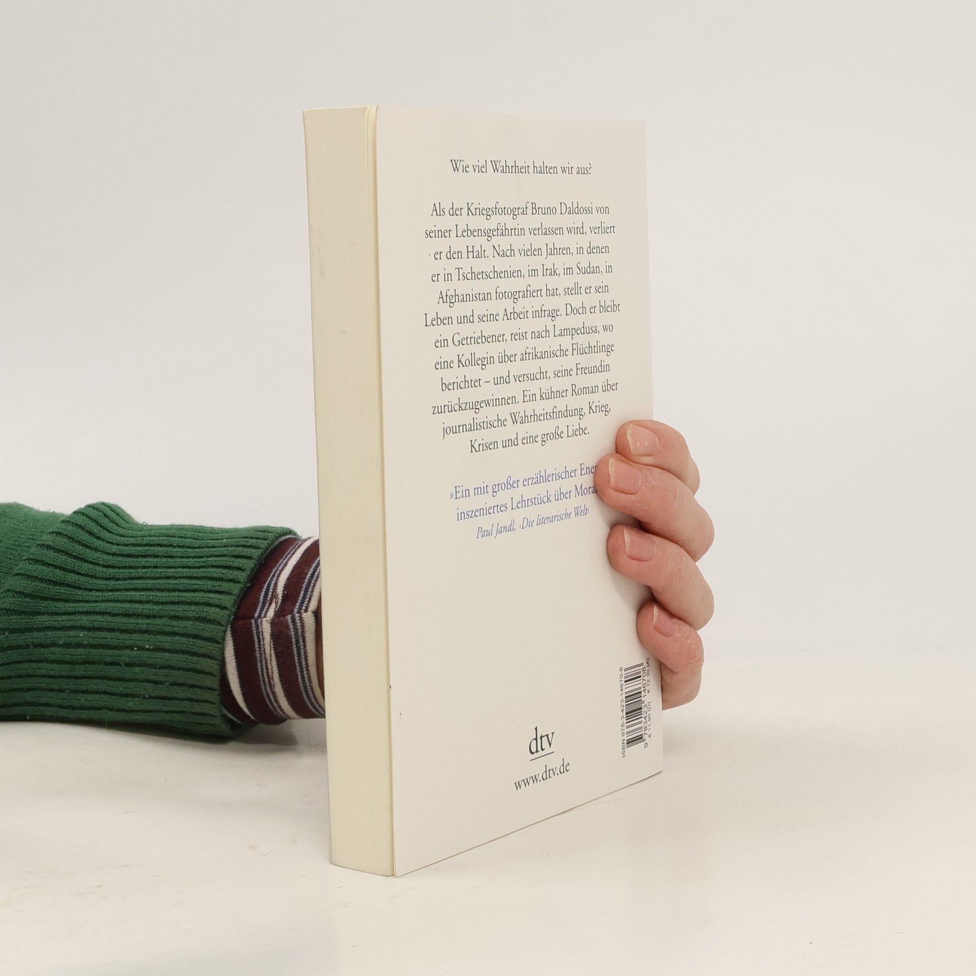 Wie viel Wahrheit halten wir aus? Bruno Daldossi ist Kriegsfotograf. Nach vielen Jahren, in denen er in Tschetschenien, im Irak, im Sudan, in Afghanistan fotografiert hat, reist er mit Anfang sechzig nur noch sporadisch in Krisengebiete. Als ihn aber seine langjährige Gefährtin Marlis, mit der er in Wien zusammenlebte, verlässt, verliert der so gehärtete Mann den Halt. In seine Trauer um den Liebesverlust mischt sich die Frage, wie mit dem Leid der Welt, das er in seinen Bildern festhält, zu leben ist. Daldossi freundet sich mit einer Journalistin an, die aus Lampedusa berichten soll, und reist ihr nach. Und er versucht, Marlis zurückzugewinnen und Verantwortung zu übernehmen für wenigstens einen Menschen, der seinen Weg gekreuzt hat.