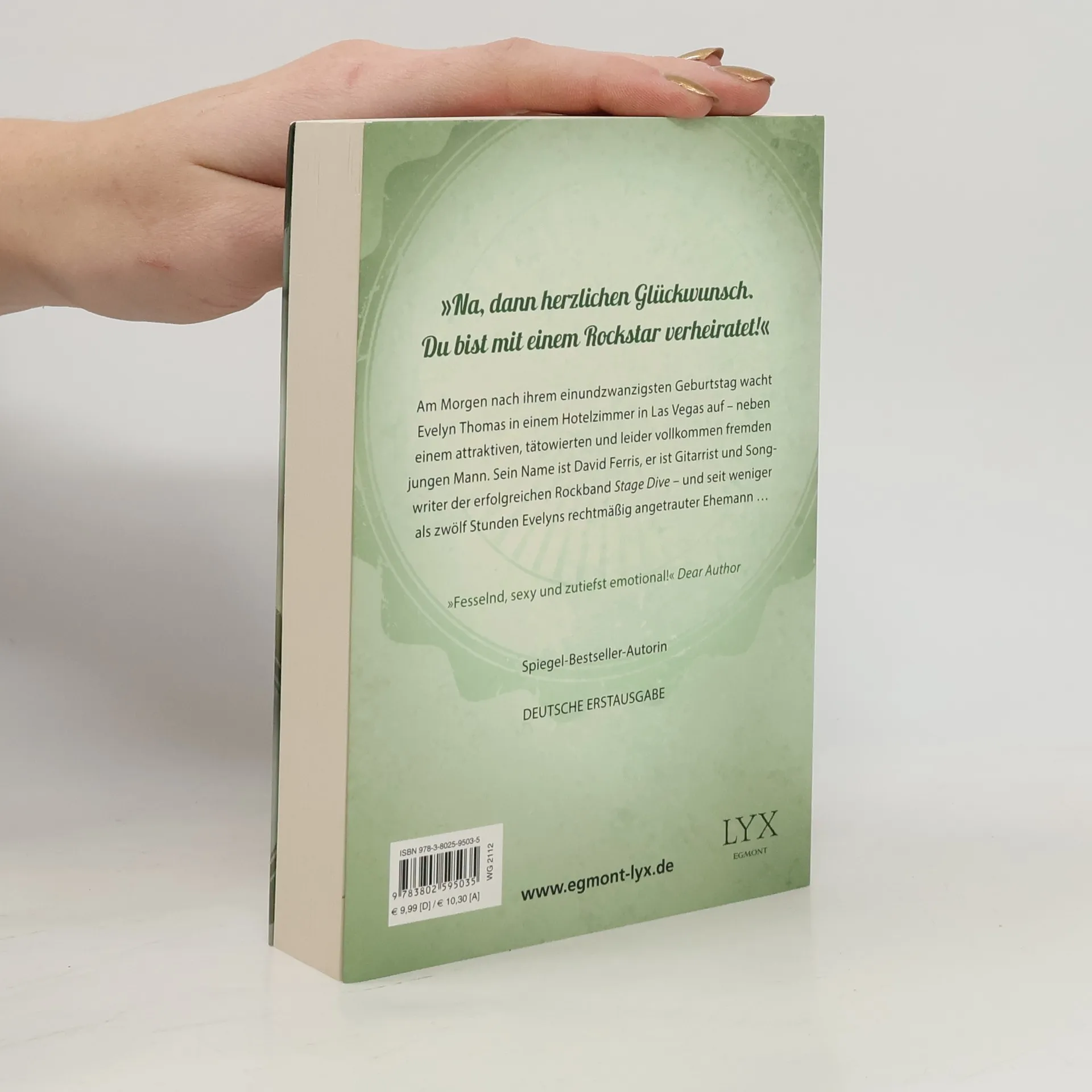 Am Morgen nach ihrem einundzwanzigsten Geburtstag wacht Evelyn Thomas in einem Hotelzimmer in Las Vegas auf – neben einem sehr attraktiven, tätowierten und leider vollkommen fremden jungen Mann. Sein Name ist David, und er ist Gitarrist der erfolgreichen Rockband “Stage Dive” … und seit weniger als zwölf Stunden Evelyns Ehemann. Die beiden müssen sich entscheiden, ob sie einander den Rücken kehren wollen oder ob da vielleicht doch mehr zwischen ihnen ist …
