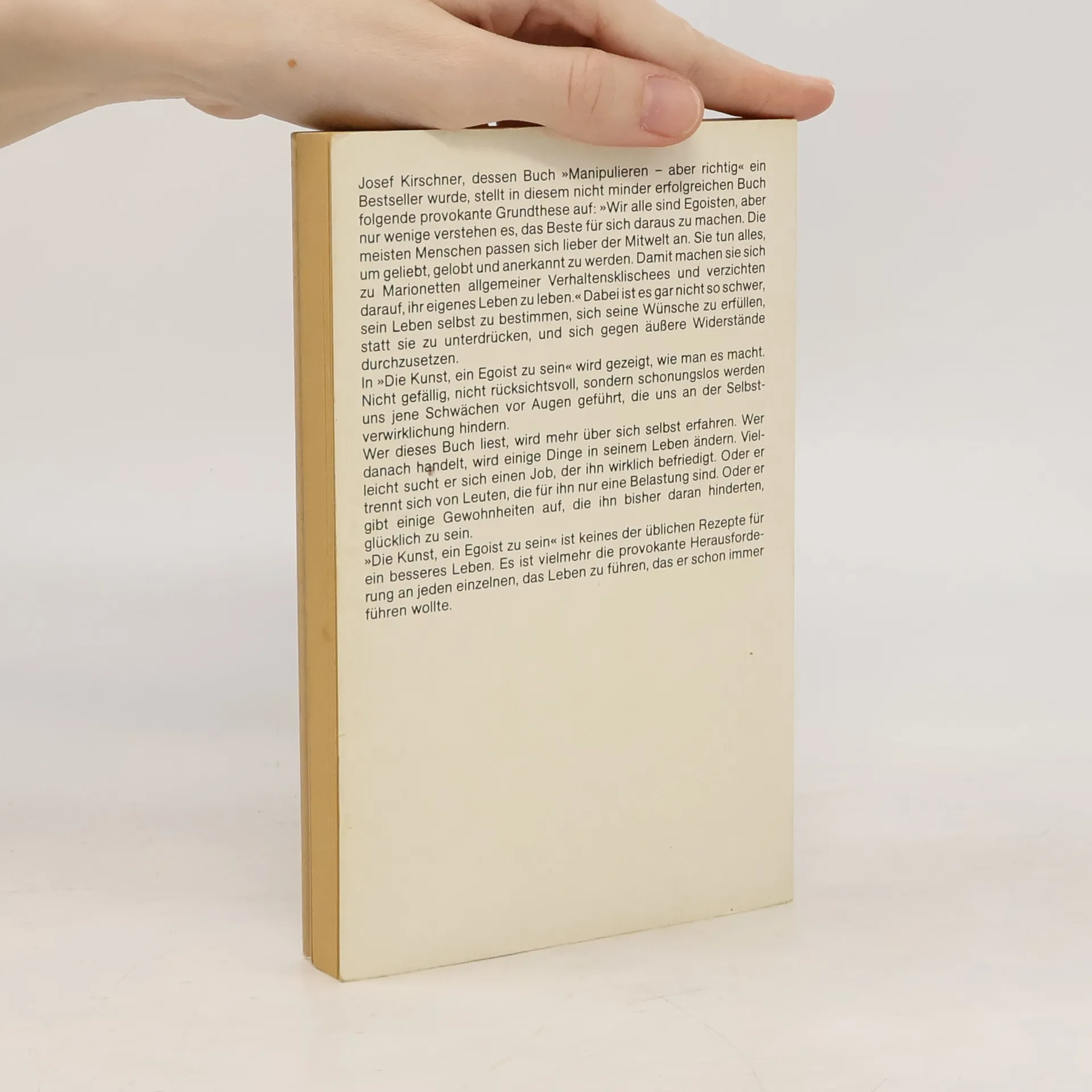 Josef Kirschner, dessen Buch \"Manipulieren - aber richtig\" ein Bestseller wurde, stellt in diesem nicht minder erfolgreichen Buch folgende provokante Grundthese auf: \"Wir alle sind Egoisten, aber nur wenige verstehen es, das Beste für sich daraus zu machen. Die meisten Menschen passen sich lieber der Mitwelt an. Sie tun alles, um geliebt, gelobt und anerkannt zu werden. Damit machen sie sich zu Marionetten allgemeiner Verhaltensklischees und verzichten darauf, ihr eigenes Leben zu leben.\" Dabei ist es gar nicht so schwer, sein Leben selbst zu bestimmen, sich seine Wünsche zu erfüllen, statt sie zu unterdrücken, und sich gegen äußere Widerstände durchzusetzen. In diesem Buch wird gezeigt, wie man es macht. Nicht gefällig, nicht rücksichtsoll, sondern schonungslos werden uns jene Schwächen vor Augen geführt, die uns an der Selbstverwirklichung hindern. Wer dieses Buch liest, wird mehr über sich selbst erfahren. Wer danach handelt, wird einige Dinge in seinem Leben ändern. Vielleicht sucht er sich einen Job, der ihn wirklich befriedigt. Oder er trennt sich von Leuten, die für ihn nur eine Belastung sind. Oder er gibt einige Gewohnheiten auf, die ihn bisher daran hinderten, glücklich zu sein. \"Die Kunst, ein Egoist zu sein\" ist keines der üblichen Rezepte für ein besseres Leben. Es ist vielmehr die provokante Herausforderung an jeden einzelnen, das Leben zu führen, das er schon immer führen wollte.
