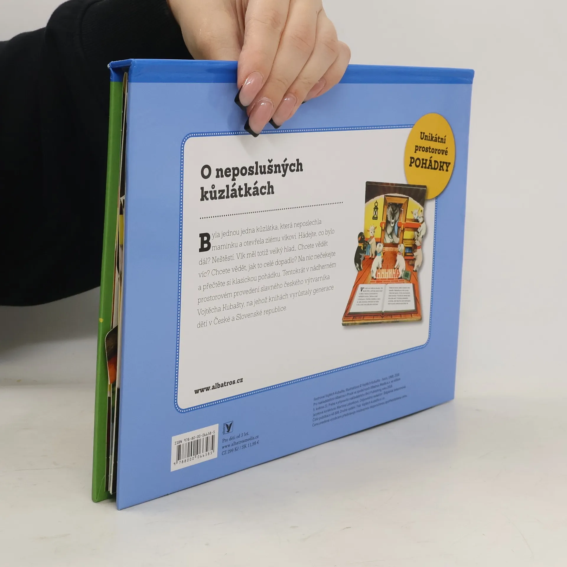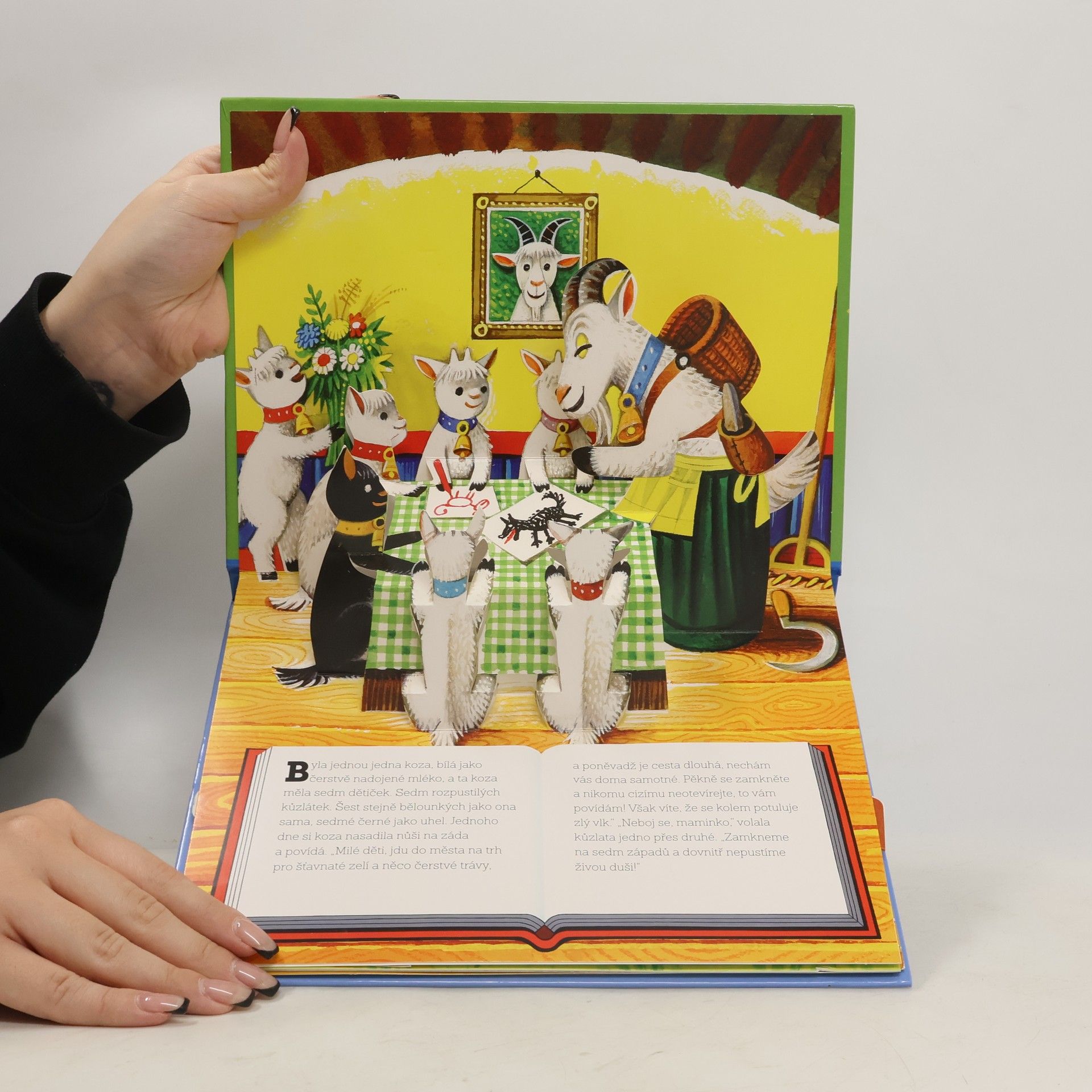 Klasická pohádka o sedmi rozpustilých kůzlátkách. Prostorové leporelo (pop-up book) s interaktivními prvky.