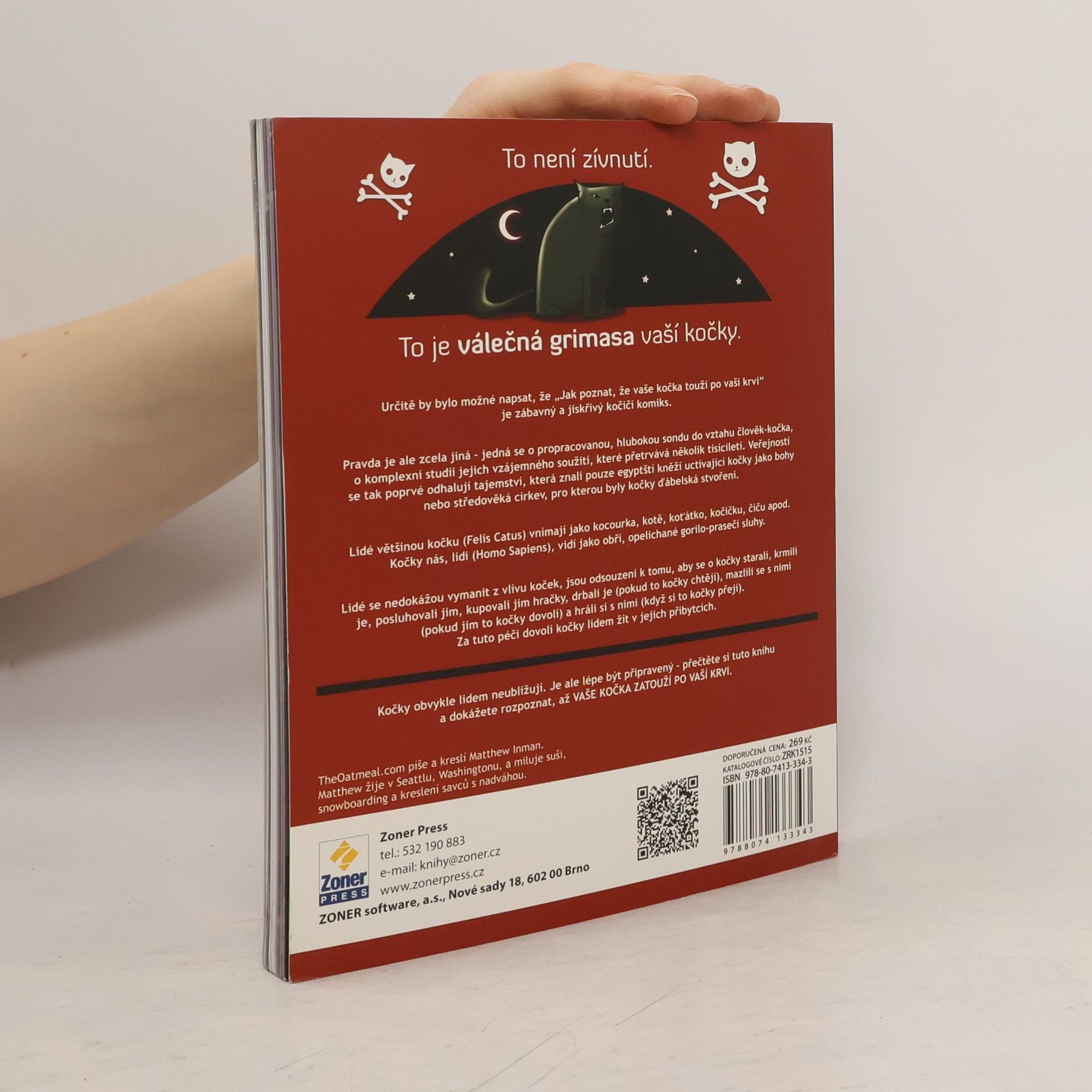 Existuje mnoho knih, které vás naučí, jak se o kočku starat. Je ale jen jediná kniha, která vám řekne, jak poznáte, že vaše kočka touží po vaší krvi. Matthew Inman píše a kreslí pro web The Oatmeal a je autorem řady komiksů, mezi nimiž vyniká jeho kočičí knížka How to tell if your cat is plotting to kill you. Všichni chovatelé a milovníci koček budou souhlasit s tím, že kočky jsou osobnostmi – vyniká to ve srovnání s ostatními domácími mazlíčky včetně psů. Asi i proto jsou kočky námětem tolika skvělých komiksů, stripů nebo kreslených filmů. Knížka prochází celou řadu témat a situací, ve kterých jistě svého vlastního domácího miláčka velmi dobře poznáte. Ať už vezmete kapitolku Jak se mazlit s kotětem nebo třeba (moje oblíbené) Nápady na dárky pro páníčka, jsou to všechno věci odpozorované ze skutečnosti a dotažené do podoby, která vás skvěle pobaví. A co víc – naučíte se rozpoznat okamžik, kdy vaše kočka začne plánovat vaši smrt. To bude nejvyšší čas, kdy byste se měli nad sebou zamyslet, najít chyby, kterých jste se dopustili, a pokusit se ještě všechno zachránit. Třeba bude stačit nějaká hračka, víc mazlení se (pokud bude kočka chtít), nějaká dobrůtka nebo omezit nevhodné chování, když vám chce spát na klíně.