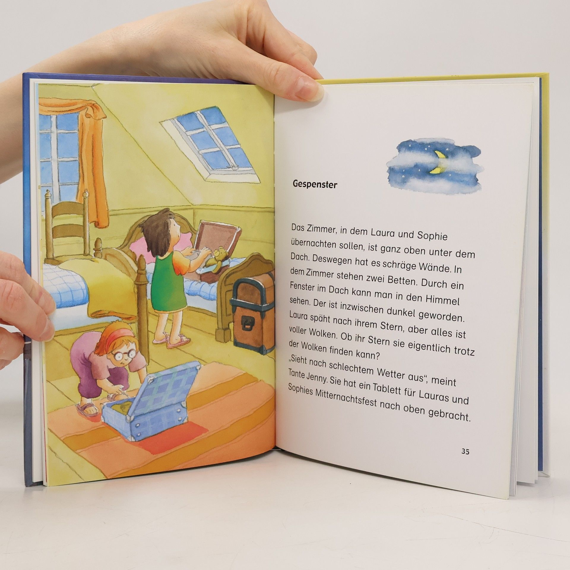 Laura ist ganz aufgeregt: Sie darf zusammen mit ihrer Freundin Sophie ein Wochenende im Haus von Sophies Tante verbringen. Und das Haus liegt direkt am Meer! Die beiden Freundinnen verbringen einen wunderschönen Tag am Strand mit Muscheln sammeln und Seesterne entdecken. Für die Nacht planen sie sogar ein „Mitternachtsfest“ ═ mit Schokokeksen und Orangensaft im Bett. Doch am Abend, als sie wegen eines Stromausfalls im Dunkeln sitzen, kriegt Laura es mit der Angst zu tun: Sind das Gespenster, die im Treppenhaus knarzen? Ob die Geister sich bis ins Zimmer wagen, in dem Laura und Sophie schlafen? Gott sei Dank ist Lauras Stern zur Stelle und mit seiner Hilfe schafft Laura es, ihre Angst zu überwinden. Ist ja schließlich richtig toll, die erste Übernachtung! Wunderbar illustriert von Klaus Baumgart Mit Glitzerstern und hohem Bildanteil