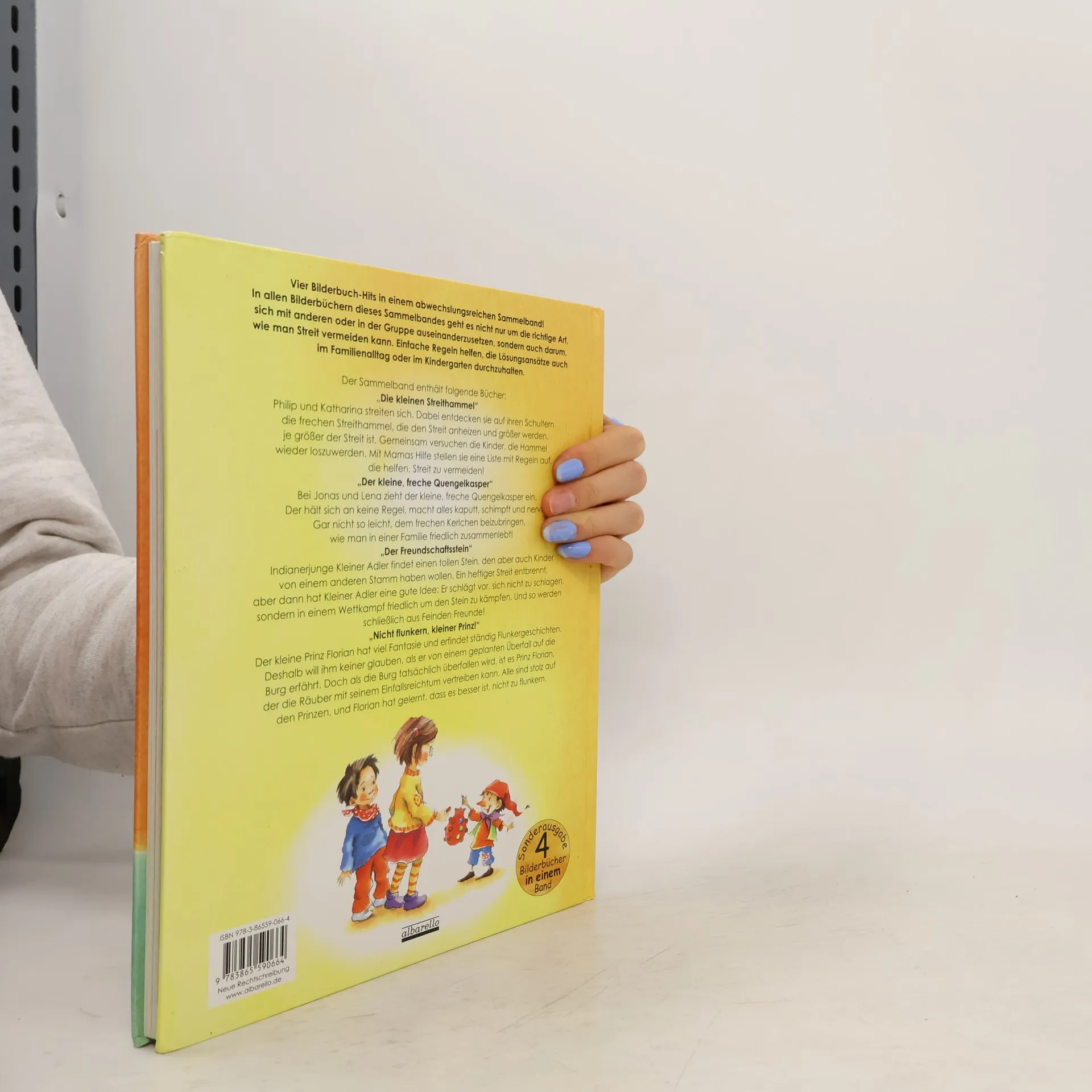 Vier Bilderbuch-Hits in einem abwechslungsreichen Sammelband! Die Geschichten thematisieren den Umgang mit anderen und das Vermeiden von Streit. Einfache Regeln unterstützen die Umsetzung im Familienalltag oder im Kindergarten. Der Sammelband umfasst folgende Bilderbuch-Hits: „Die kleinen Streithammel“: Philip und Katharina streiten sich, während freche Streithammel auf ihren Schultern den Konflikt anheizen. Gemeinsam mit ihrer Mama erstellen sie eine Liste mit Regeln, um Streit zu vermeiden. „Der kleine, freche Quengelkasper“: Bei Jonas und Lena zieht ein ungezogener Quengelkasper ein, der keine Regeln beachtet und alles durcheinanderbringt. Es ist eine Herausforderung, ihm beizubringen, wie man in einer Familie friedlich zusammenlebt. „Der Freundschaftsstein“: Kleiner Adler, ein Indianerjunge, findet einen begehrten Stein, der auch von anderen Kindern gewünscht wird. Ein Streit bricht aus, doch Kleiner Adler schlägt vor, friedlich in einem Wettkampf um den Stein zu kämpfen, wodurch Feindschaft in Freundschaft umschlägt. „Nicht flunkern, kleiner Prinz!“: Prinz Florian, der gerne fantasievolle Geschichten erfindet, wird nicht ernst genommen, als er von einem Überfall auf die Burg erfährt. Doch als es tatsächlich passiert, kann er die Räuber mit seinem Einfallsreichtum vertreiben und lernt, dass Ehrlichkeit der bessere Weg ist.