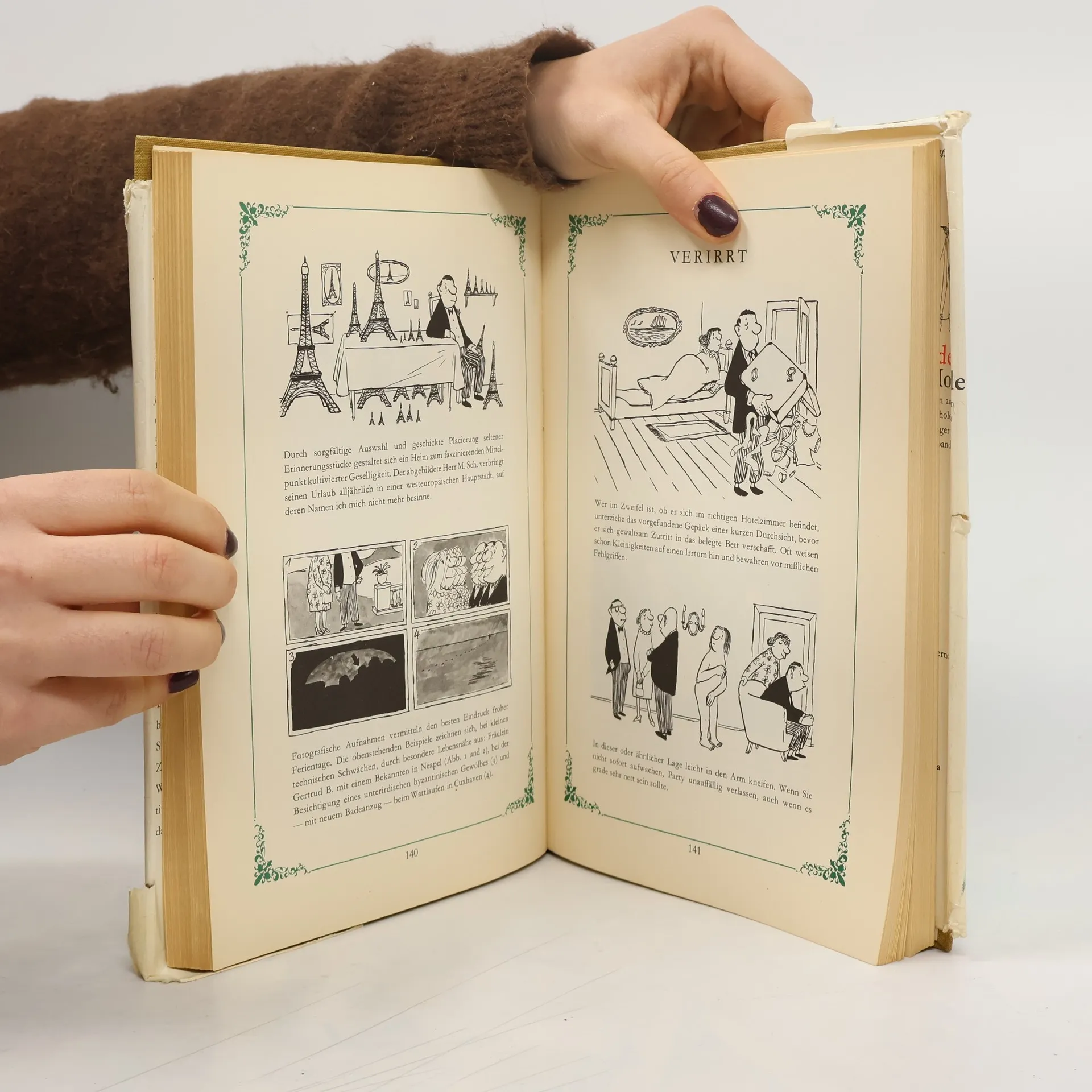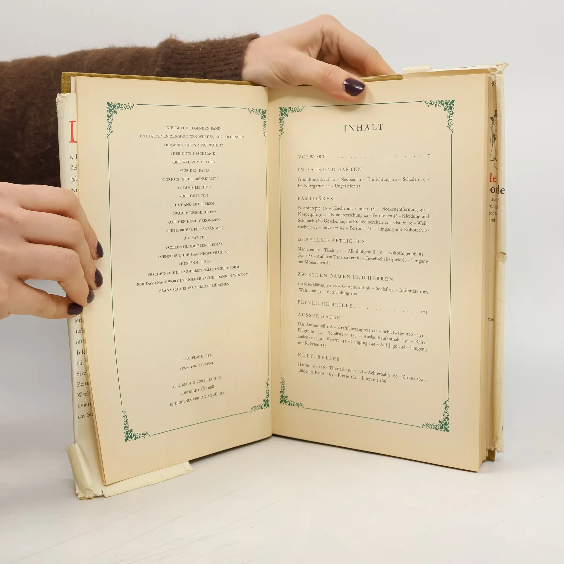 Ein Klassiker des modernen Lebens. Entstanden aus Loriots Gefühl der inneren Verpflichtung, »dem Menschen von heute ein Nachschlagewerk in die Hand zu geben, das ihm auch in kritischen Situationen korrektes Verhalten ermöglicht.« 500 Abbildungen und erläuternde Texte geben Auskunft über Tischmanieren, Gattenwahl, Einrichtung, Fleckenentfernung, Kleidung, Garten- und Körperpflege, Berufssorgen, Automobil-, Rasen- und Skisport, Alkohol- und Nikotingenuß, Husten, Theater, Film, Reisen, Jagd, Verirrungen, Nashörner, Maulwürfe, Hunde, Katzen, Mäuse und manch anderes mehr. Das unentbehrliche Kompendium für alle Haushaltungen.