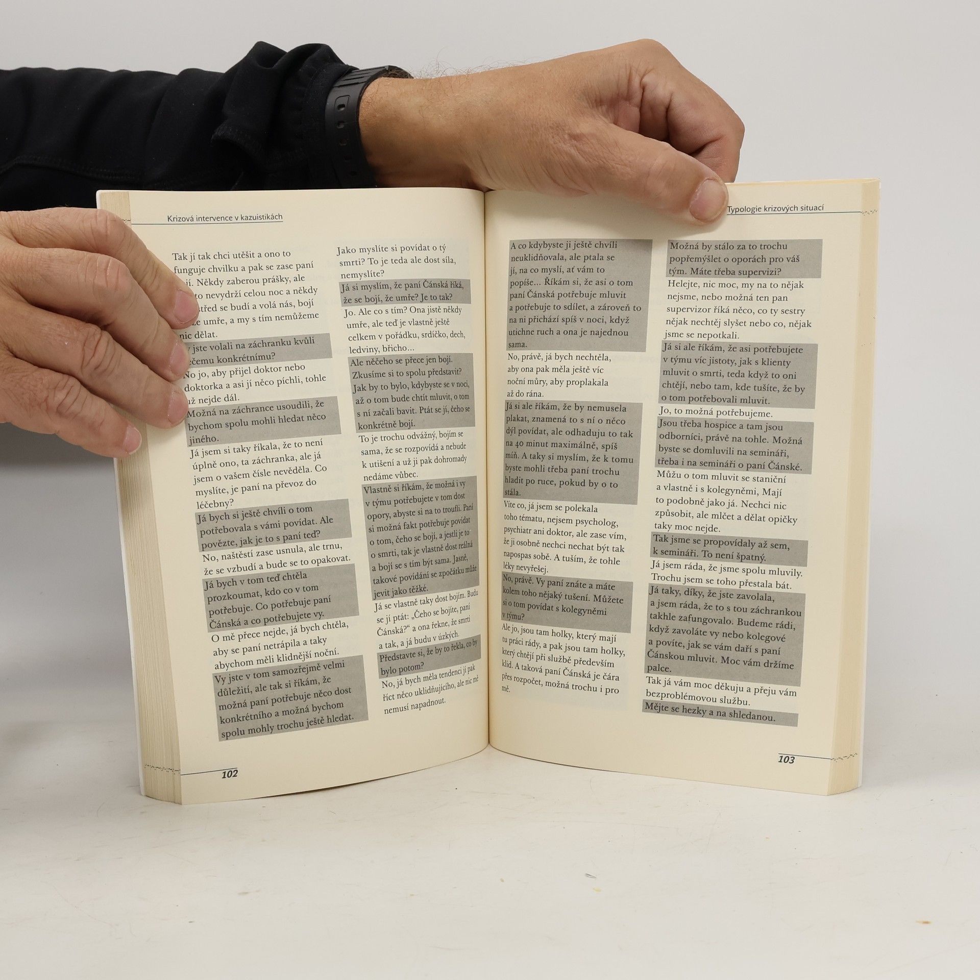 První část knihy pomocí příběhů podává základní údaje o krizi a krizové intervenci a na kazuistikách ilustruje základní postupy řešení krizových situací. Druhá část pojednává o jednotlivých typech těchto situací a ukazuje hlavní vodítka pro řešení (na co nezapomenout, s čím a jak pracovat) i řadu kazuistik, které probíraná témata propojují. Kazuistiky pocházejí z oblasti telefonické intervence i z rozhovorů tváří v tvář. Záměrem knihy není podat vyčerpávající informace o krizové intervenci, ale ukázat praktické příběhy krize, které mohou potkat každého z nás. Každý příběh je originální a neexistuje pro něj jediné řešení. Každý pracovník pracuje jiným způsobem a používá různé metody v různém kontextu. Proto má předkládaný text čtenáře podporovat v hledání dalších cest a vlastních způsobů při krizové práci. Publikace tak zahrnuje i pasáže, které se čtenářem interagují pomocí otázek, úkolů či nedokončených částí.