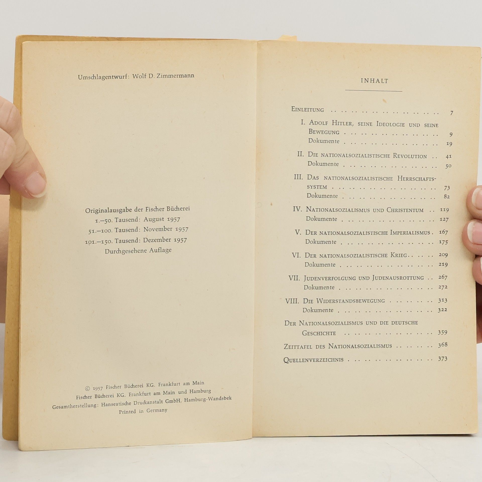 Die Erfahrung hat gelehrt, dass geschichtliche Ereignisse erst in gehörigem Abstand interpretiert und sachlich dargestellt werden können. Aus diesem Grunde unterlagen auch viele Publikationen über das Phänomen des Nationalsozialismus tendenziösen Einflüssen und begegneten dadurch zum Teil dem Widerstand der Leserschaft. Wir haben daher versucht, die politischen Ereignisse der jüngsten deutschen Vergangenheit selbst sprechen zu lassen. Die Dokumente, die Walther Hofer, Professor für Neuere Geschichte an der Universität Bern, zusammengestellt und kommentiert hat, sprechen eine beredte Sprache. Jeder Satz hat authentischen Aussagewert und steht für eine menschliche und politische Haltung, die als abschreckendes Exempel der Gegenwart vor Augen geführt werden muss. Wir hoffen, dass dieses Brevier der Unmenschlichkeit, das zugleich die Kräfte eines anderen, besseren Deutschland beschwört, seine Wirkung auf die Leser nicht verfehlen wird.