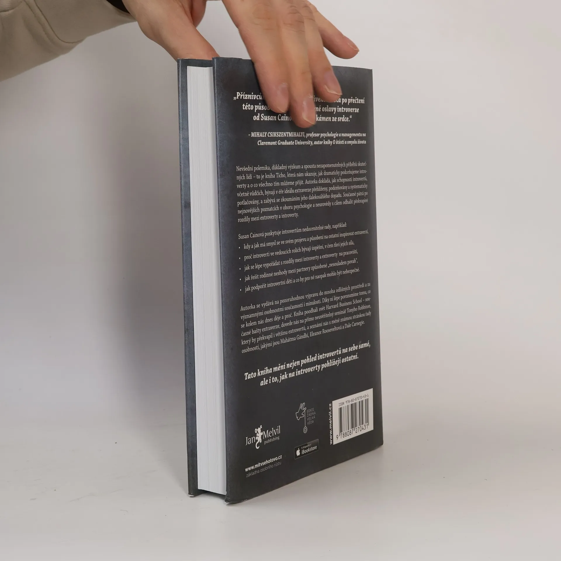 Kolik skutečných introvertů znáte? Odpověď vás možná překvapí. V kultuře, která nás od základní školy až po byznys vychovává k týmové práci, je vše nastavené pro úspěch extrovertů. Až díky této knize získali ti tiší svou mluvčí: Susan Cainovou. Její čtivý, důkladný a překvapivý text o tiché síle introvertů se stal velice rychle bestsellerem a autorka celebritou. Je to paradox, když sama o sobě prohlašuje, že je introvertem?