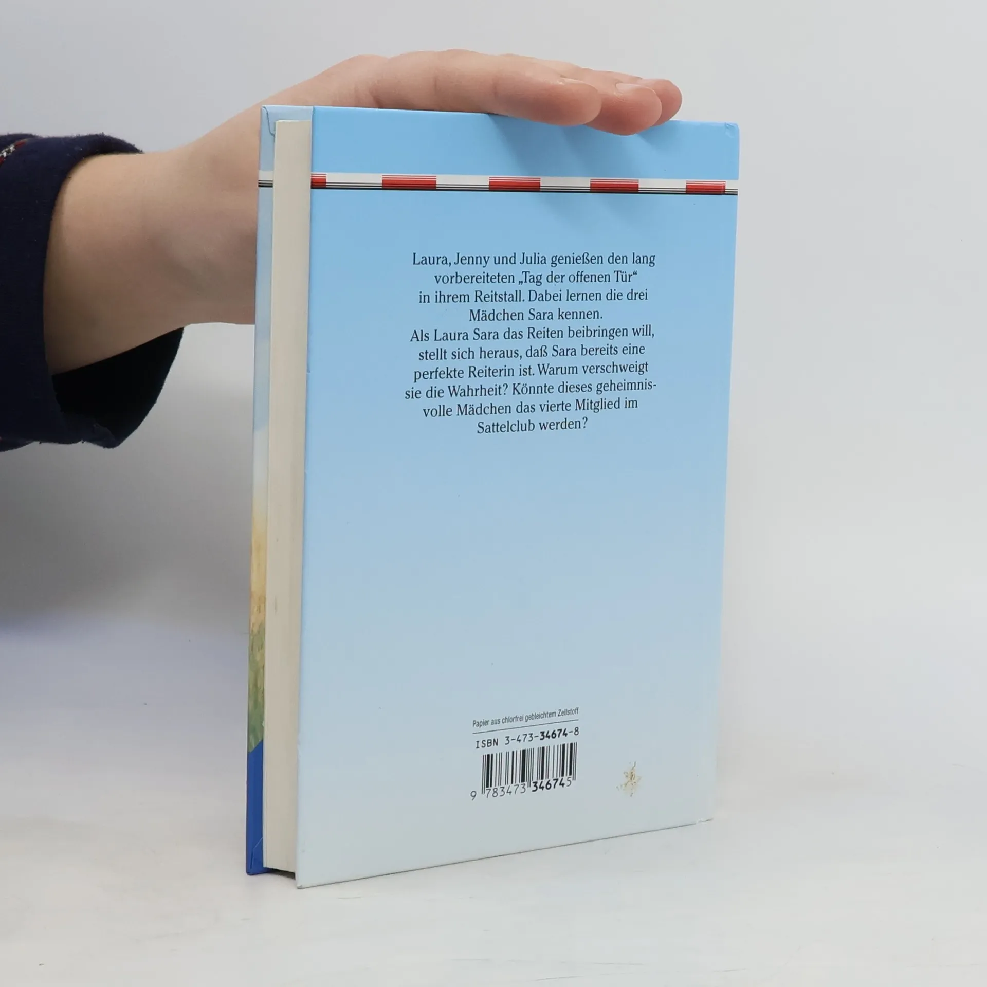Laura, Jenny und Julia genießen den lang vorbereiteten "Tag der offenen Tür" in ihrem Reitstall. Dabei lernen die drei Mädchen Sara kennen. Als Laura Sara das Reiten beibringen will, stellt sich heraus, daß Sara bereits eine perfekt Reiterin ist. Warum verschweigt sie die Wahrheit? Könnte dieses geheimnisvolle Mädchen das vierte Mitglied im Sattelclub werden?