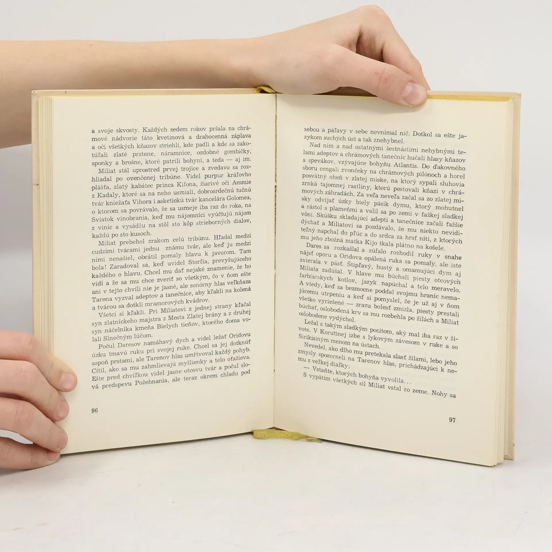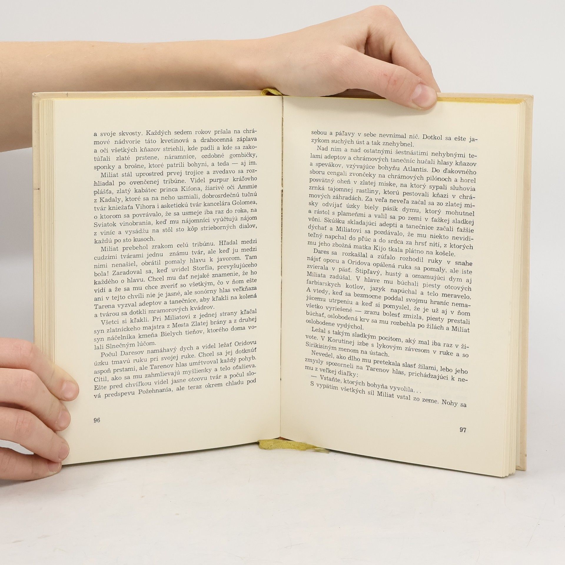 …Videl ho bežať, syna svojho jediného, zrenicu svojho oka, radosť a pýchou svojej staroby, videl ho predbiehať po jednom kráľových milcov aj kňaza v posvätenej tunike — a potom videl mihnúť sa vzduchom kňazov obetný nôž a syna klesnúť na kolená, o dva schody nižšie od toho, na ktorom skamenel ohnivý oblak. Storfius zavrel oči, aby sa nemusel dívať na červený ker, zasadený medzi synove lopatky, rozkvitajúci čim ďalej, tým krvavejšími kvetmi a ťažko si sadol ku kráľovmu stolu. Mal pred sebou ešte jednu povinnosť: Zosňať kliatbu zo Sirikisinej nevinnej hlavy. Zodvihol ruku, ešte stále preteplenú synovým stiskom, že hodí kocku do kráľovho pohára, keď zo záhrady vyletel vysoký detský výkrik strachu, hrôzy, beznádeje a najväčšej ľudskej bolesti, uväznený jedenásť rokov v Siriki-sinom hrdle: — Matka! Každý ho počul a každý videl klesnúť Siiikis na kolená pred mŕtvym Miliatom. Jej biele ruky objímat červený ker, boriť sa múry kamenného domu a pukať sa zem a lámať sa staré stromy a padat žeravý popol a blížiť sa horu vody vody vody.