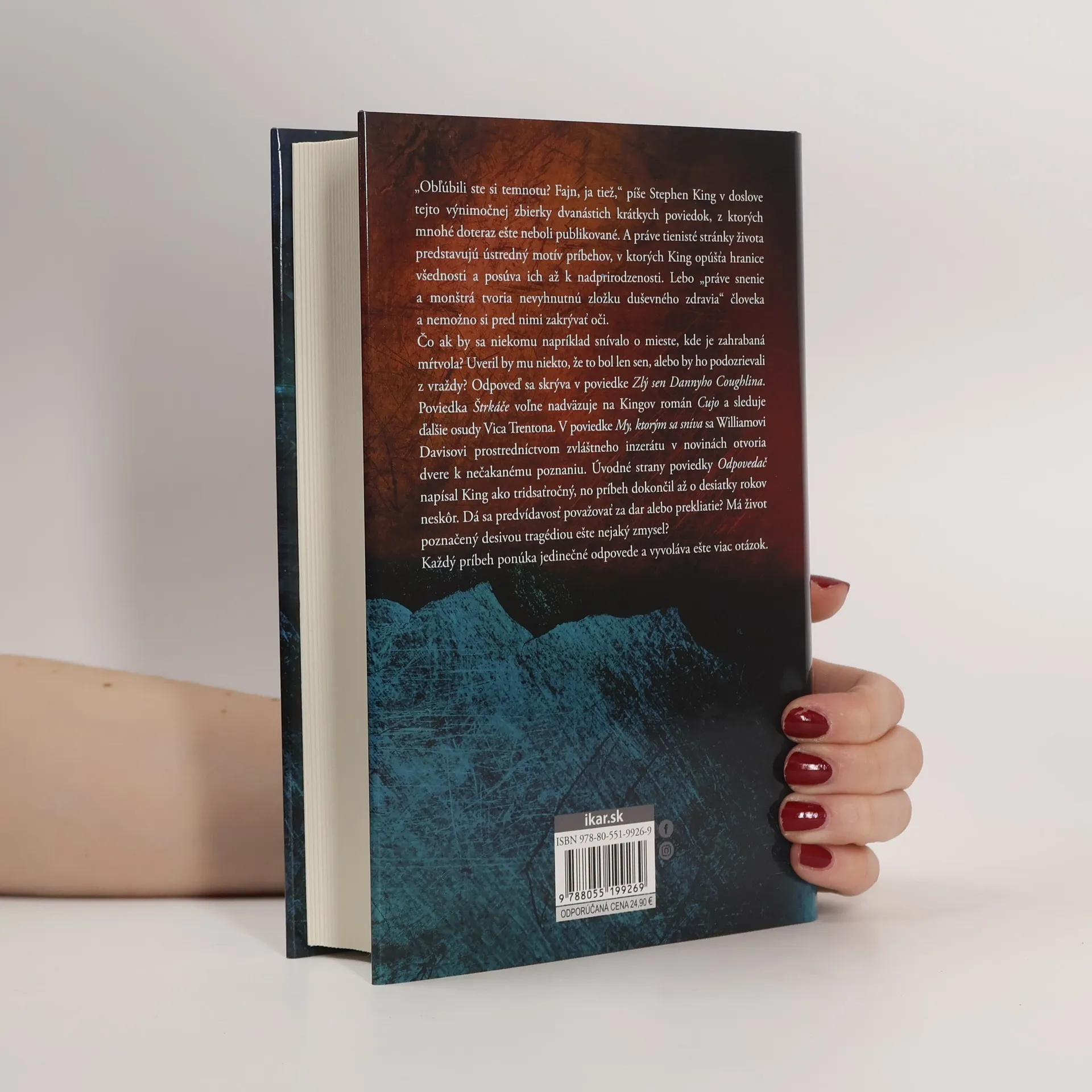 Kolekcia najlepších a dosiaľ nepublikovaných poviedok od kultového rozprávača „Obľúbili ste si temnotu? Fajn, ja tiež,“ píše Stephen King v doslove tejto výnimočnej zbierky dvanástich krátkych poviedok, z ktorých mnohé doteraz ešte neboli publikované. A práve tienisté stránky života predstavujú ústredný motív príbehov, v ktorých King opúšťa hranice všednosti a posúva ich až k nadprirodzenosti. Lebo „práve snenie a monštrá tvoria nevyhnutnú zložku duševného zdravia“ človeka a nemožno si pred nimi zakrývať oči. Čo ak by sa niekomu napríklad snívalo o mieste, kde je zahrabaná mŕtvola? Uveril by mu niekto, že to bol len sen alebo by ho podozrievali z vraždy? Odpoveď sa skrýva v poviedke Zlý sen Dannyho Coughlina. Poviedka Štrkáče voľne nadväzuje na Kingov román Cujo a sleduje ďalšie osudy Vica Trentona. V poviedke My, ktorým sa sníva sa Williamovi Davisovi prostredníctvom zvláštneho inzerátu v novinách otvoria dvere k nečakanému poznaniu. Úvodné strany poviedky Odpovedač napísal King ako tridsaťročný no príbeh dokončil až o desiatky rokov neskôr. Dá sa predvídavosť považovať za dar alebo prekliatie? Má život poznačený desivou tragédiou ešte nejaký zmysel? Každý príbeh ponúka jedinečné odpovede a vyvoláva ešte viac otázok.