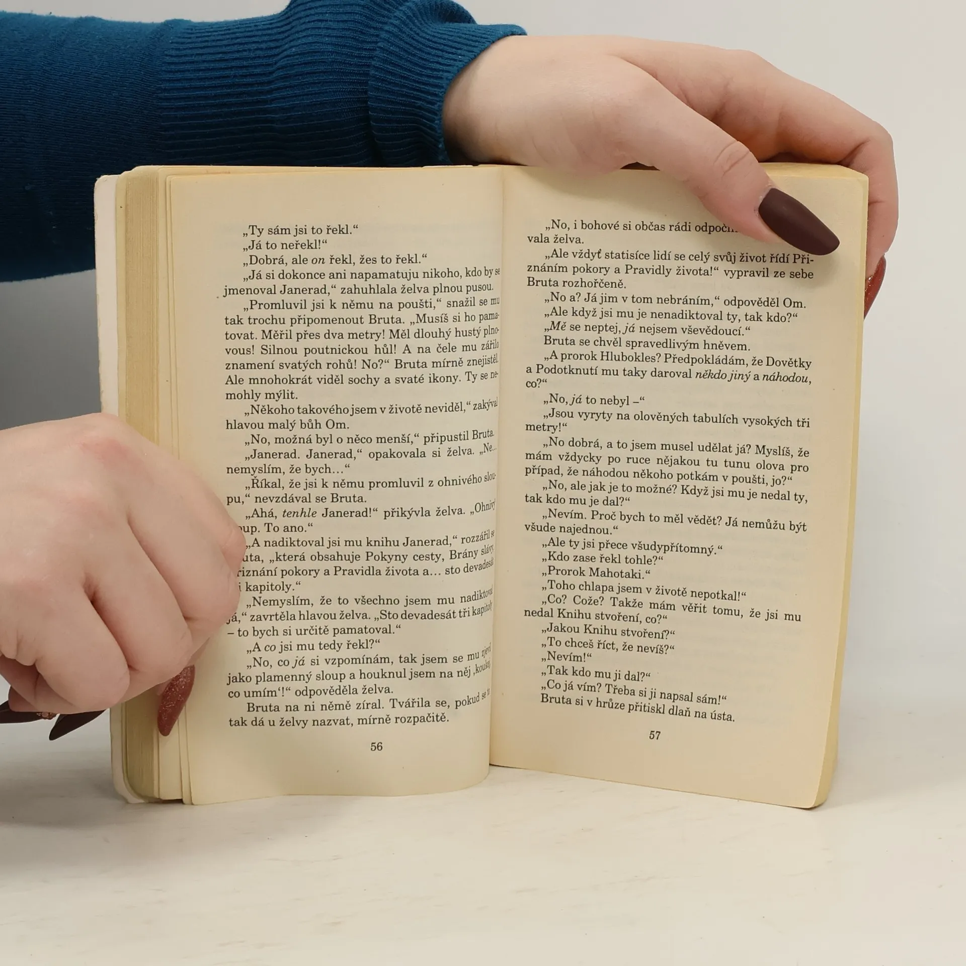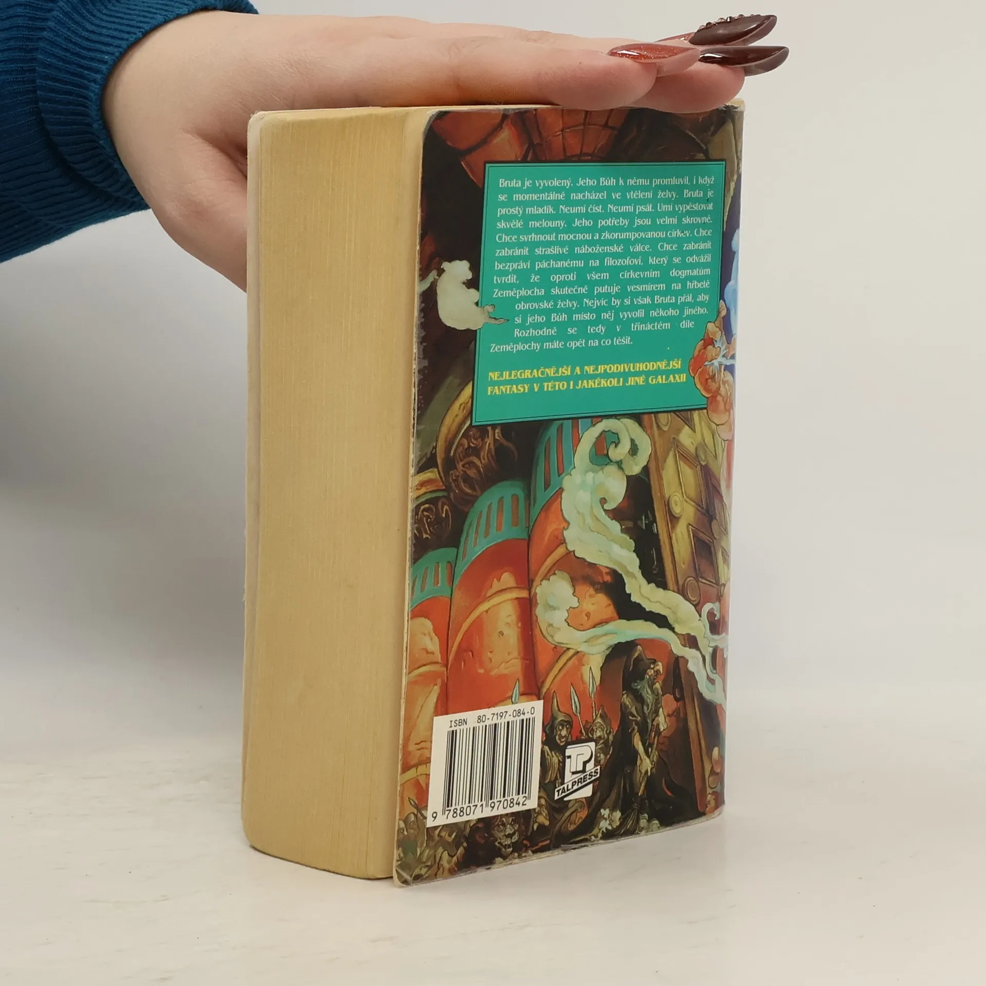 Bruta je vyvolený. Jeho Bůh k němu promluvil, i když se momentálně nacházel ve vtělení želvy. Bruta je prostý mladík, neumí číst. neumí psát. Umí vypěstovat skvělé melouny. Jeho potřeby jsou velmi skrovné. Chce svrhnout mocnou a zkorumpovanou církev. Chce zabránit strašlivé náboženské válce. Chce zabránit bezpráví páchanému na filozofovi, který se odvážil tvrdit, že oproti všem církevním dogmatům Zeměplocha skutečně putuje vesmírem na hřbetě obrovské želvy, nejvíc by si však Bruta přál, aby si jeho Bůh místo něj vyvolil někoho jiného. Dotisk r. 2001, 2007