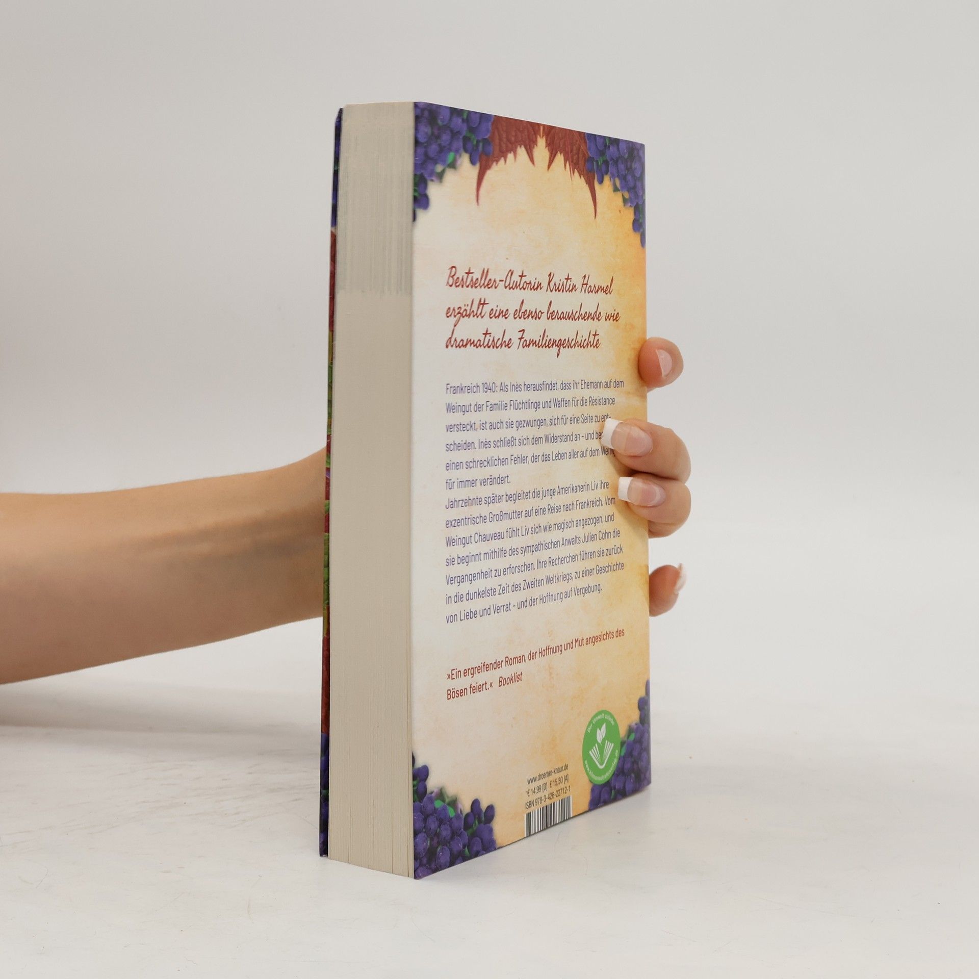 Eine grausame Zeit, ein schrecklicher Fehler und die Hoffnung auf Vergebung: Die Geschichte spielt in Frankreich während des Zweiten Weltkriegs. 1940 entdeckt Inés, dass ihr Ehemann auf dem Familienweingut Flüchtlinge und Waffen für die Résistance versteckt. Sie entscheidet sich, dem Widerstand beizutreten, begeht jedoch einen folgenschweren Fehler, der das Leben aller auf dem Weingut für immer verändert. Jahrzehnte später reist die junge Amerikanerin Liv mit ihrer exzentrischen Großmutter nach Frankreich. Sie fühlt sich magisch zum Weingut Chauveau hingezogen und spürt, dass ihre Großmutter einen besonderen Grund für die Reise hat. Unterstützt von dem sympathischen Anwalt Julien Cohn beginnt Liv, die Geschichte des Weinguts zu erforschen. Ihre Nachforschungen führen sie zurück in die dunkelsten Zeiten des Krieges, in eine Erzählung von Liebe und Verrat sowie der Hoffnung auf Vergebung. Diese tragische und wunderschöne Familien- und Liebesgeschichte verbindet sich nahtlos mit den Themen von Harmels vorherigem Erfolg und wird alle begeistern, die große historische Romane über das 20. Jahrhundert schätzen.
