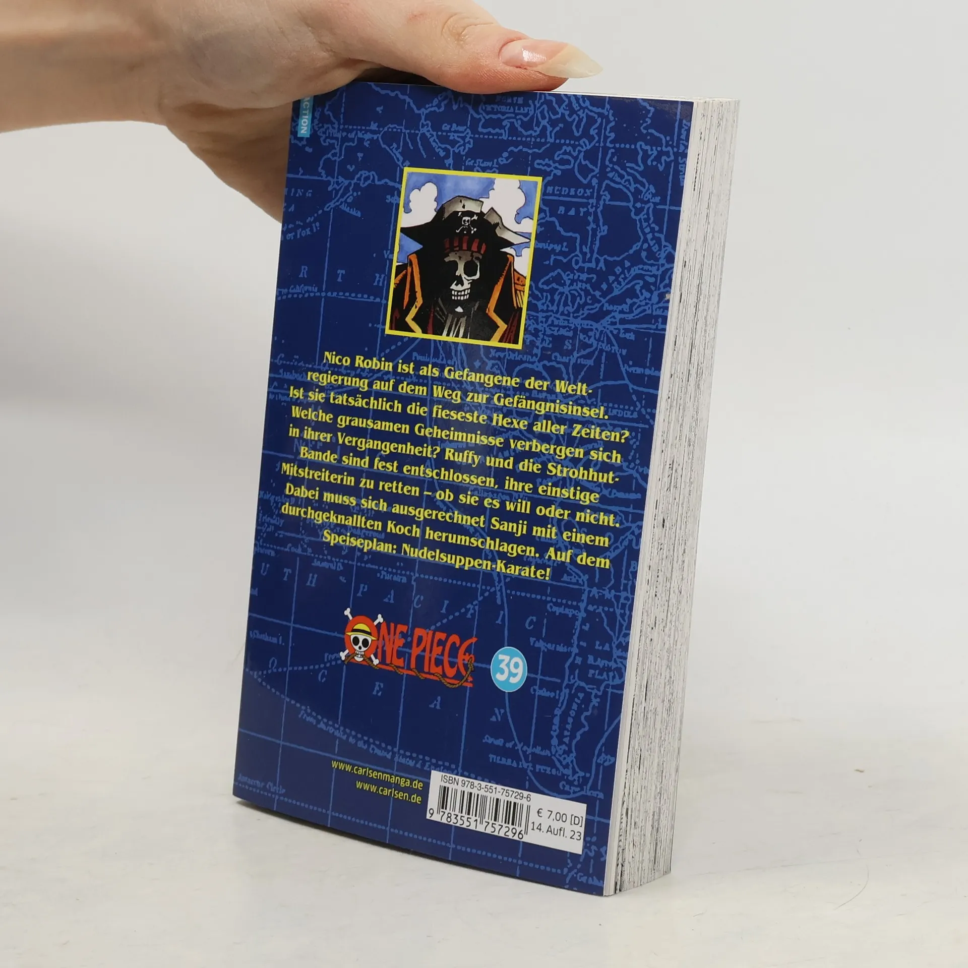 Der beliebteste Manga der Welt! Erlebe die Geschichte des zukünftigen Königs der Piraten in einer unvergleichlichen Geschichte voller Action, Abenteuer, Dramatik, Freundschaft und Humor. Mit über 500 Millionen verkauften Bänden weltweit ist One Piece die meistverkaufte Mangaserie der Geschichte! Nico Robin ist als Gefangene der Weltregierung auf dem Weg zur Gefängnisinsel. Ist sie tatsächliche die fieseste Hexe aller Zeiten? Welche grausamen Geheimnisse verbergen sich in ihrer Vergangenheit? Ruffy und die Strohhut-Bande sind fest entschlossen, ihre einstige Mitstreiterin zu retten – ob sie es will oder nicht. Dabei muss sich ausgerechnet Sanji mit einem durchgeknallten Koch herumschlagen. Auf dem Speiseplan: Nudelsuppen-Karate! Für Fans von Naruto, Dragon Ball, My Hero Academia und Fairy Tail!