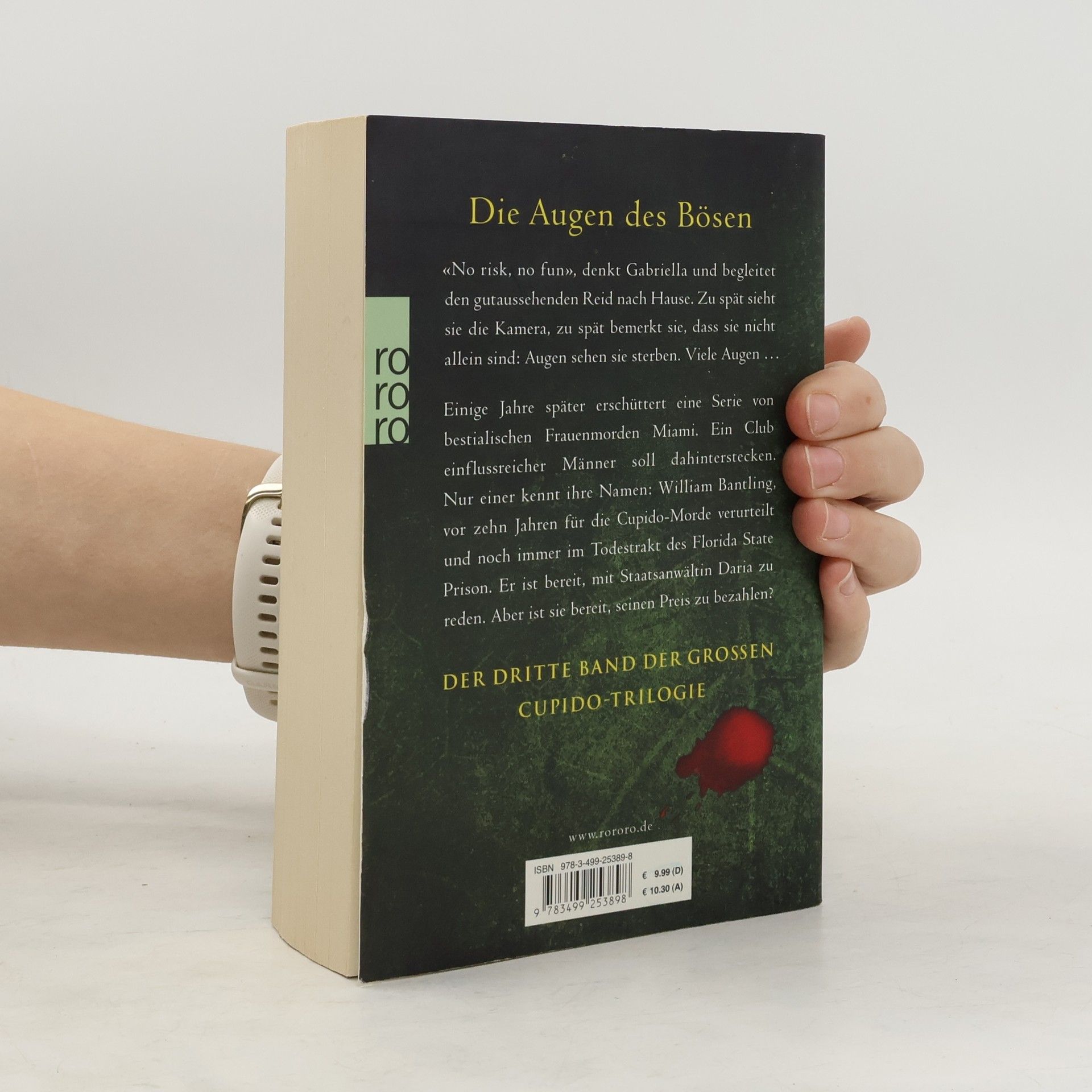Die Augen des Bösen«No risk, no fun», denkt Gabriella und begleitet den gutaussehenden Reid nach Hause. Zu spät sieht sie die Kamera, zu spät bemerkt sie, dass sie nicht allein sind: Augen sehen sie sterben. Viele Augen …Einige Jahre später erschüttert eine Serie von bestialischen Frauenmorden Miami. Ein Club einflussreicher Männer soll dahinterstecken. Nur einer kennt ihre Namen: William Bantling, vor zehn Jahren für die Cupido-Morde verurteilt und noch immer im Todestrakt des Florida State Prison. Er ist bereit, mit Staatsanwältin Daria zu reden. Aber ist sie bereit, seinen Preis zu bezahlen?Der dritte Band der großen Cupido-Reihe.