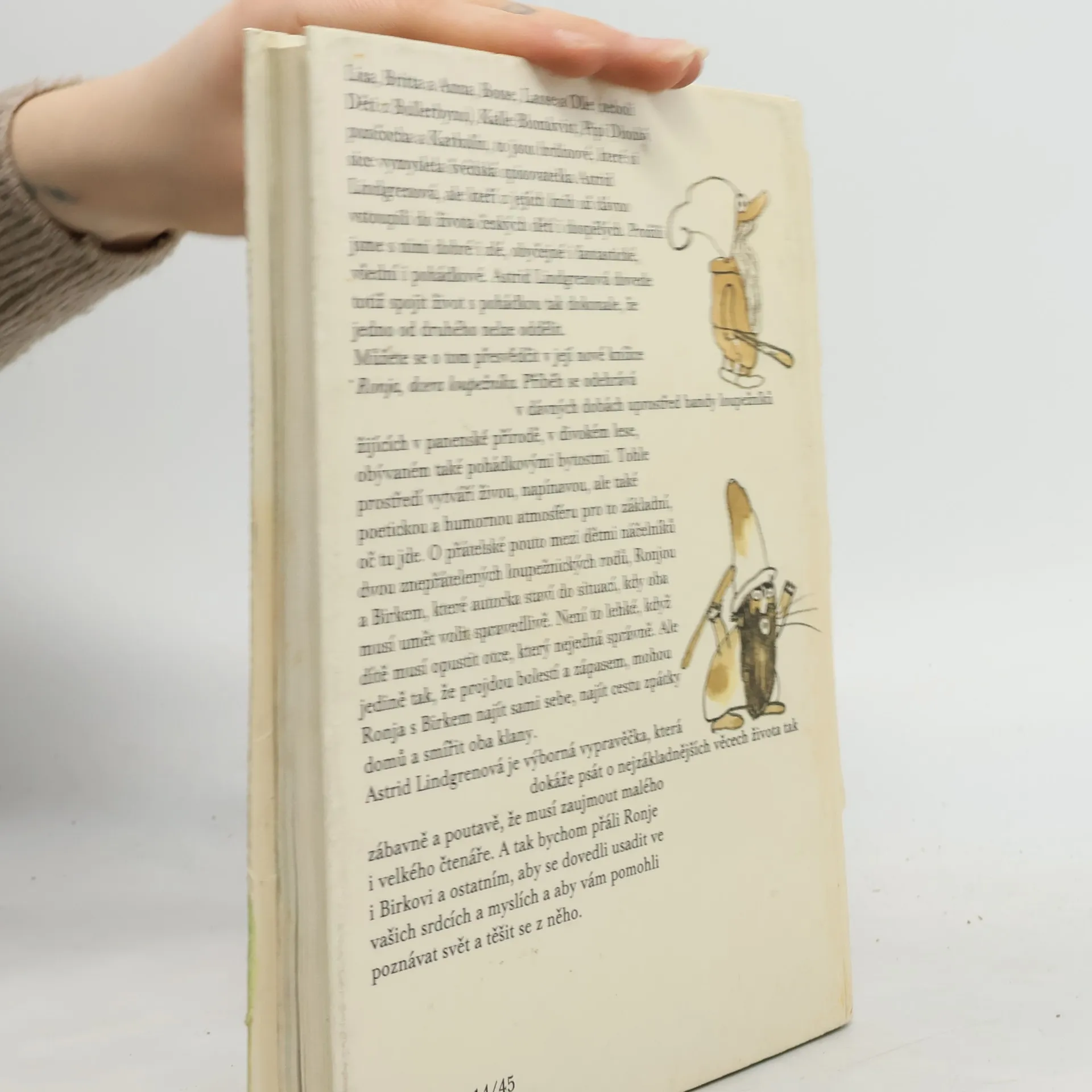 Ronja se narodila za bouřlivé noci, která byla tak děsuplná, že napůl rozťala prastarý hrad, v němž vládl její otec bandě loupežníků. Odtrženou část hradu ihned obsadil na smrt znepřátelený rod lupiče Borky. A co čert nechtěl, Ronja našla svého nejlepšího kamaráda právě v synovi Borky, Birkovi. Co všechno nebezpečného i hezkého z toho vzešlo, se dozvíte v tomto příběhu, jenž se odehrává v divokém lese a lukách se skřítky, větrnicemi, smíchem i nadějí, že se Ronje i Birkovi snad podaří smířit odedávna znesvářené klany. 13-747-87