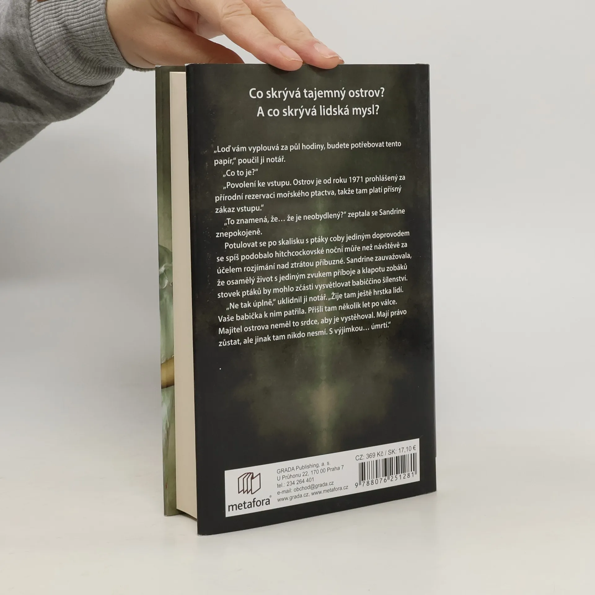 Jediná možnost, jak přežít, je uniknout... Co skrývá tajemný ostrov? A co skrývá lidská mysl? Sandrine, která se před nedávnem přistěhovala do Normandie, dostává výzvu od notáře, aby si zajela převzít osobní věci z domu po své zemřelé babičce – svérázné ženě, jež žila osaměle na maličkém ostrově nedaleko pobřeží a odmítala se stýkat s dcerou i s vnučkou. Sandrine vystupuje z lodi na šedivém, chladném ostrově a setkává se s hrstkou obyvatel, starých lidí žijících v téměř naprostém odloučení od civilizace. Všichni jí popisují babičku jako milou a laskavou ženu, tedy obraz daleký tomu, co o ní Sandrine vyprávěla matka. Na ostrově vládne podivná atmosféra. Stačí pár hodin, aby si Sandrine uvědomila, že zdejší obyvatelé skrývají nějaké tajemství. Cosi, z čeho mají hrůzu. Proč tedy odtud nikdo z nich neodjede? Co se stalo s dětmi z prázdninového tábora, narychlo uzavřeného v roce 1949? Namísto odpovědí je mladá žena po několika dnech nalezena, jak bloudí po pláži na pevnině s oblečením zmáčeným krví, která není její… Román získal cenu za nejlepší francouzský román roku 2019, která se uděluje na každoročně konaném literárním festivalu detektivek v Cognacu.