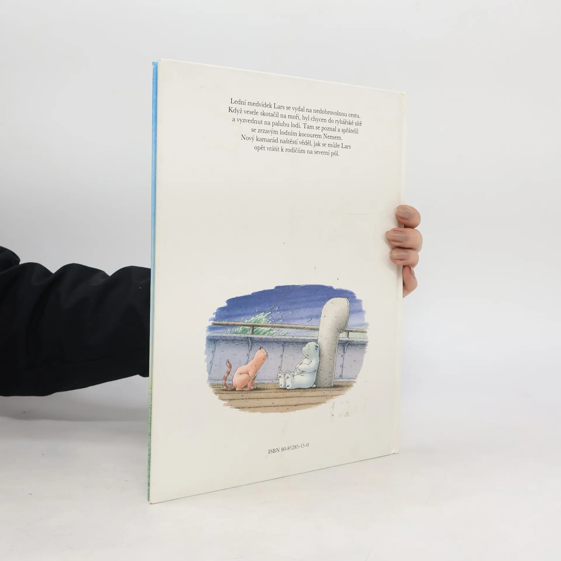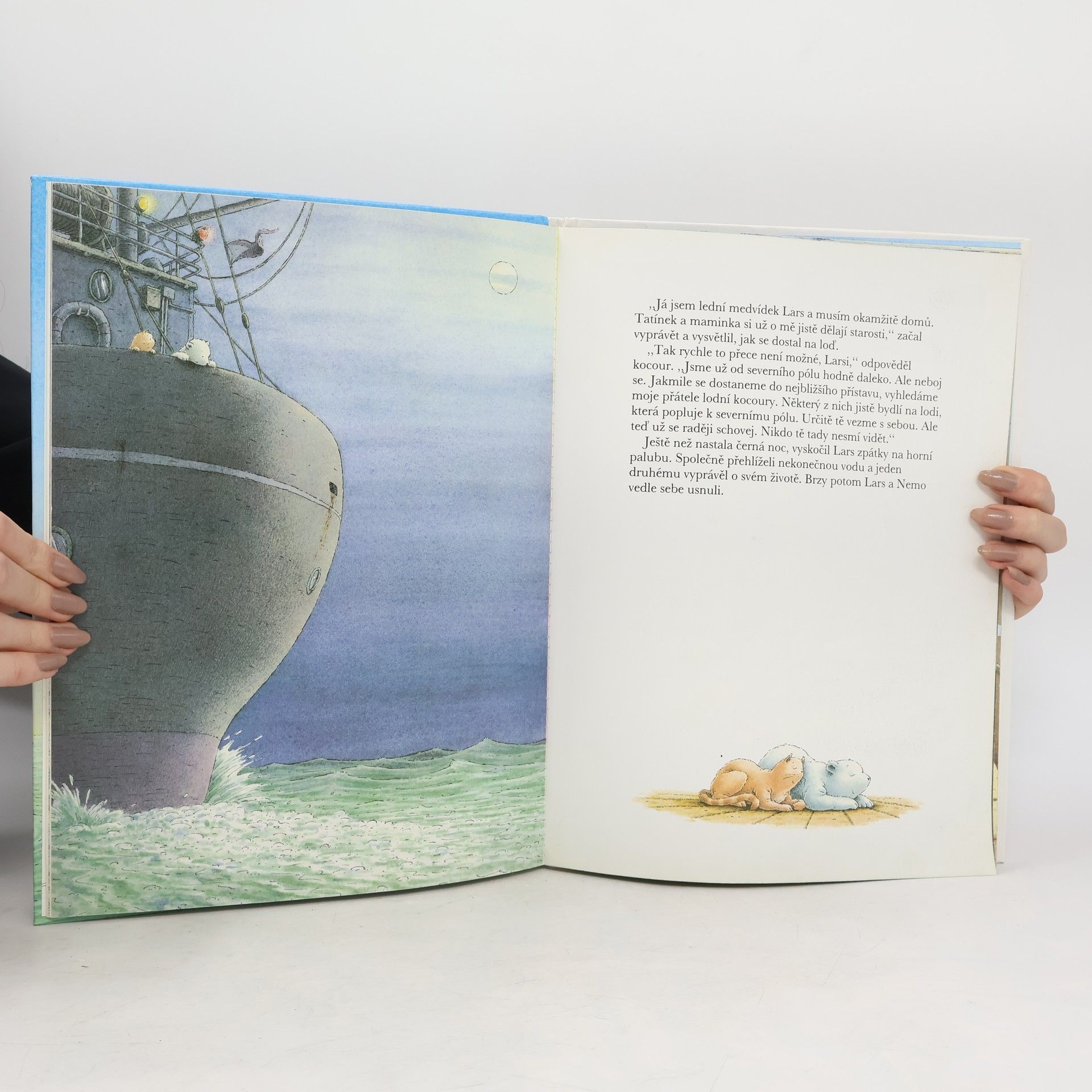Vypráví a sám ilustruje autor. Lední medvídek Lars se vydal na nedobrovolnou cestu. Když vesele skotačil na moři, byl chycen do rybářské sítě a vyzvednut na palubu lodi. Tam se poznal a spřátelil se zrzavým lodním kocourem Nemem. Nový kamarád naštěstí věděl, jak se může Lars opět vrátit k rodičům na severní pol.