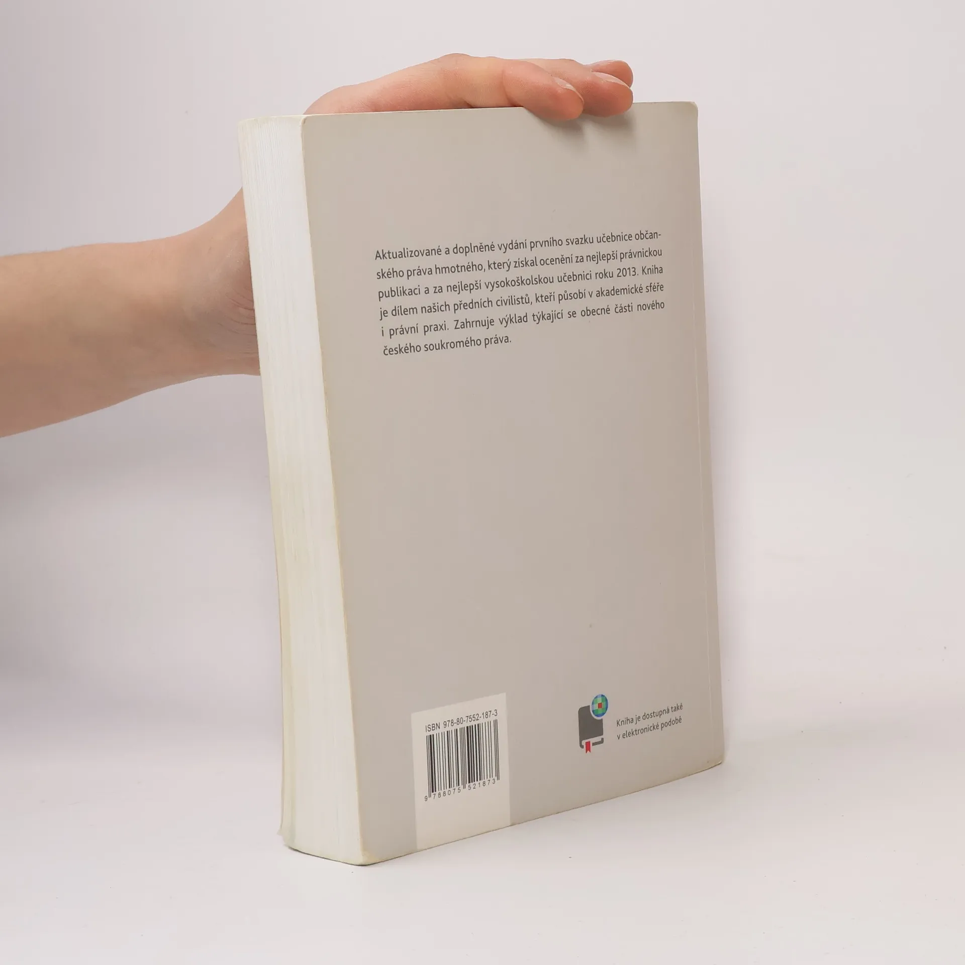 Aktualizované a doplněné vydání prvního svazku učebnice občanského práva hmotného, který získal ocenění za nejlepší právnickou publikaci a za nejlepší vysokoškolskou učebnici roku 2013. Kniha je dílem našich předních civilistů, kteří působí v akademické sféře i právní praxi. Zahrnuje výklad týkající se obecné části nového českého soukromého práva.