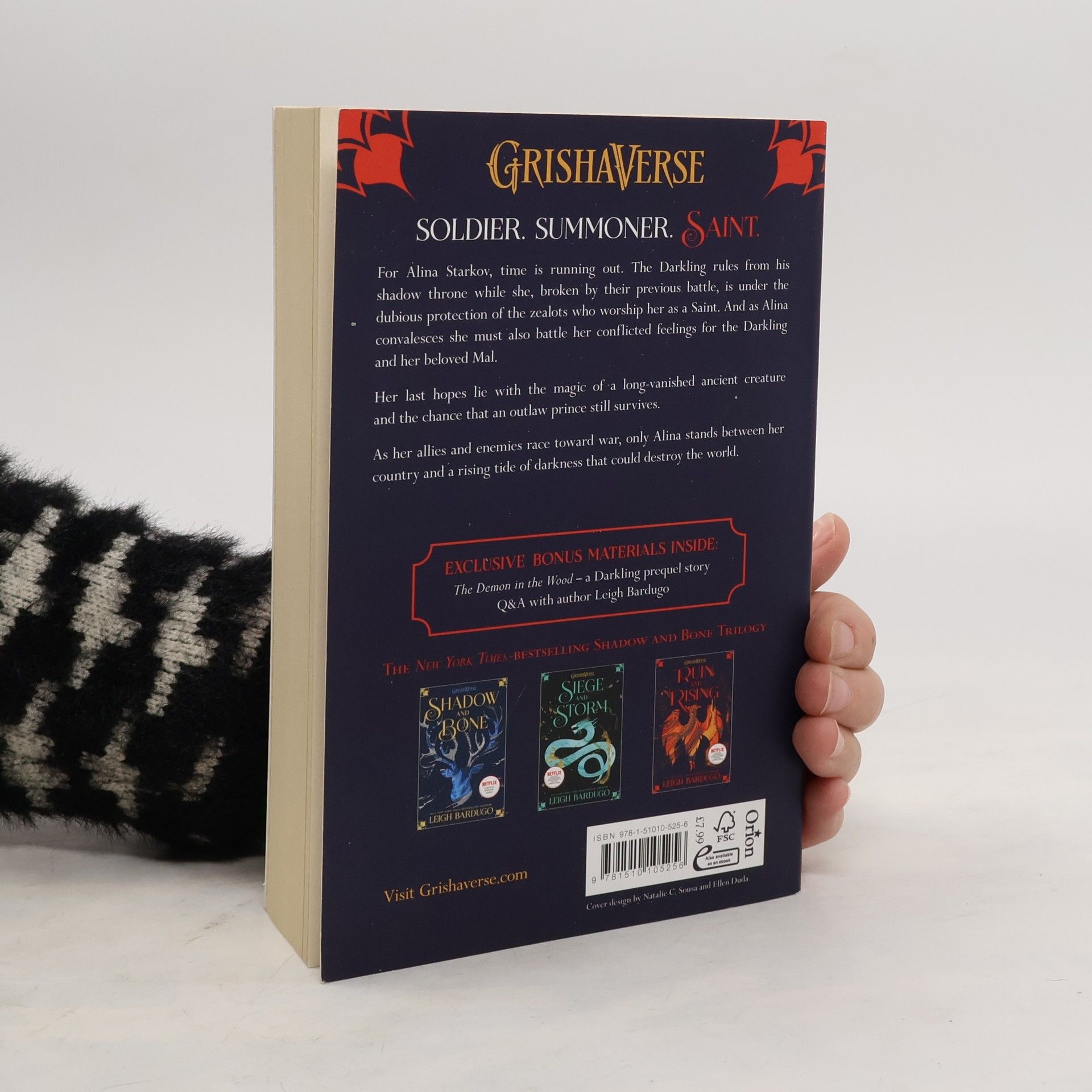 Soldier. Summoner. Saint. The nation's fate rests with a broken Sun Summoner, a disgraced tracker, and the shattered remnants of a once-great magical army. The Darkling rules from his shadow throne while a weakened Alina Starkov recovers from their battle under the dubious protection of the zealots who worship her as a Saint. Now her hopes lie with the magic of a long-vanished ancient creature and the chance that an outlaw prince still survives. As her allies and enemies race toward war, only Alina stands between her country and a rising tide of darkness that could destroy the world. To win this fight, she must seize a legend's power but claiming the firebird may be her ruin