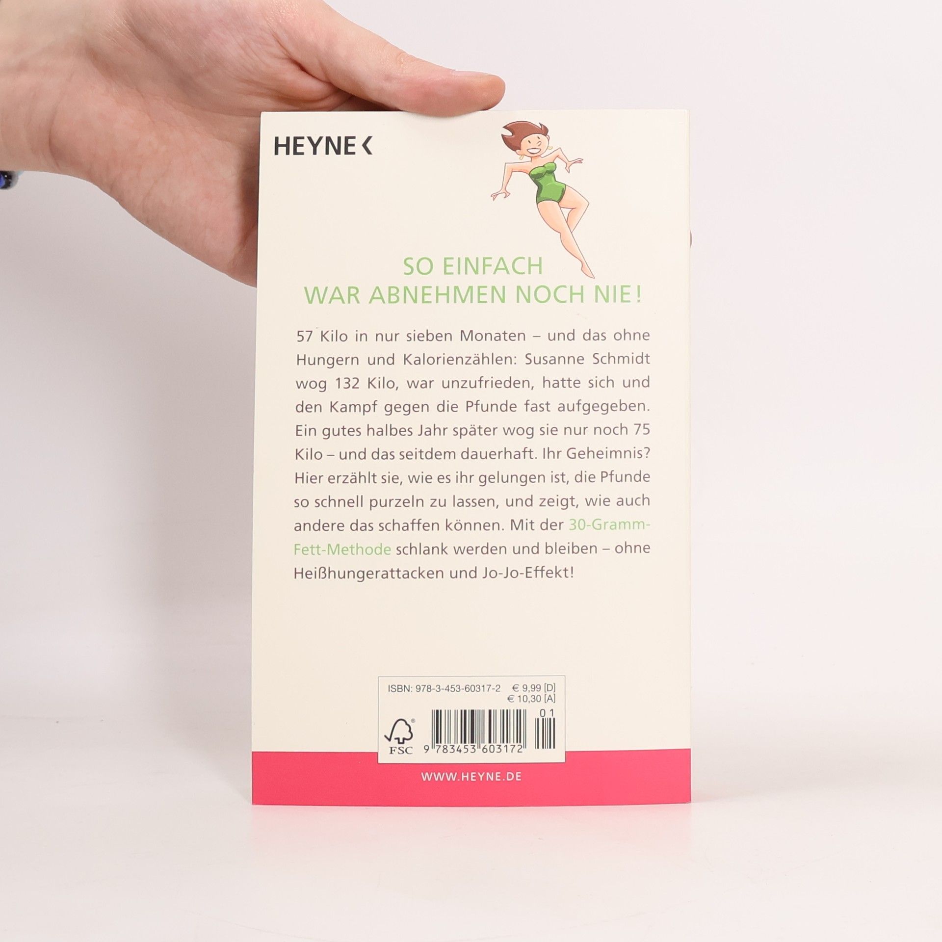57 Kilo in nur sieben Monaten – und das ohne Hungern und Kalorienzählen: Susanne Schmidt wog 132 Kilo, war unzufrieden, hatte sich und den Kampf gegen die Pfunde fast aufgegeben. Ein gutes halbes Jahr später wog sie nur noch 75 Kilo – und das seitdem dauerhaft. Ihr Geheimnis? Hier erzählt sie, wie es ihr gelungen ist, die Pfunde so schnell purzeln zu lassen, und wie auch andere das schaffen können. Mit der 30-Gramm-Fett- Methode schlank werden und bleiben – so unkompliziert war Abnehmen noch nie!
