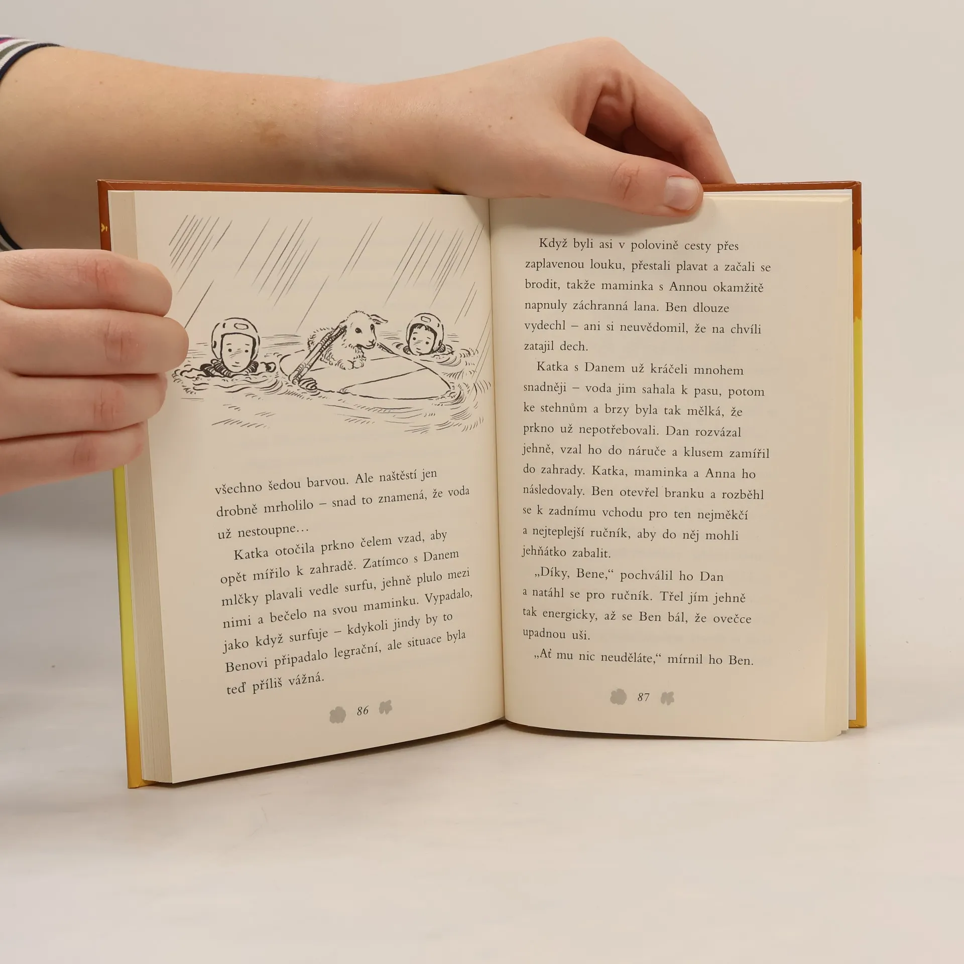 Celý týždeň prší. Riaditeľ oznámil deťom, že škola bude až do odvolania zatvorená, lebo hydrometeorologický ústav vyhlásil prvý povodňový stupeň. Ben sa teší, že bude môcť zostať doma, no po príjazde na farmu si všimne, že na vyvýšenej časti pastviny uviazlo opustené jahniatko. Treba zavolať do záchranárskeho centra… Podarí sa vrátiť jahniatko jeho zúfalej mamičke?