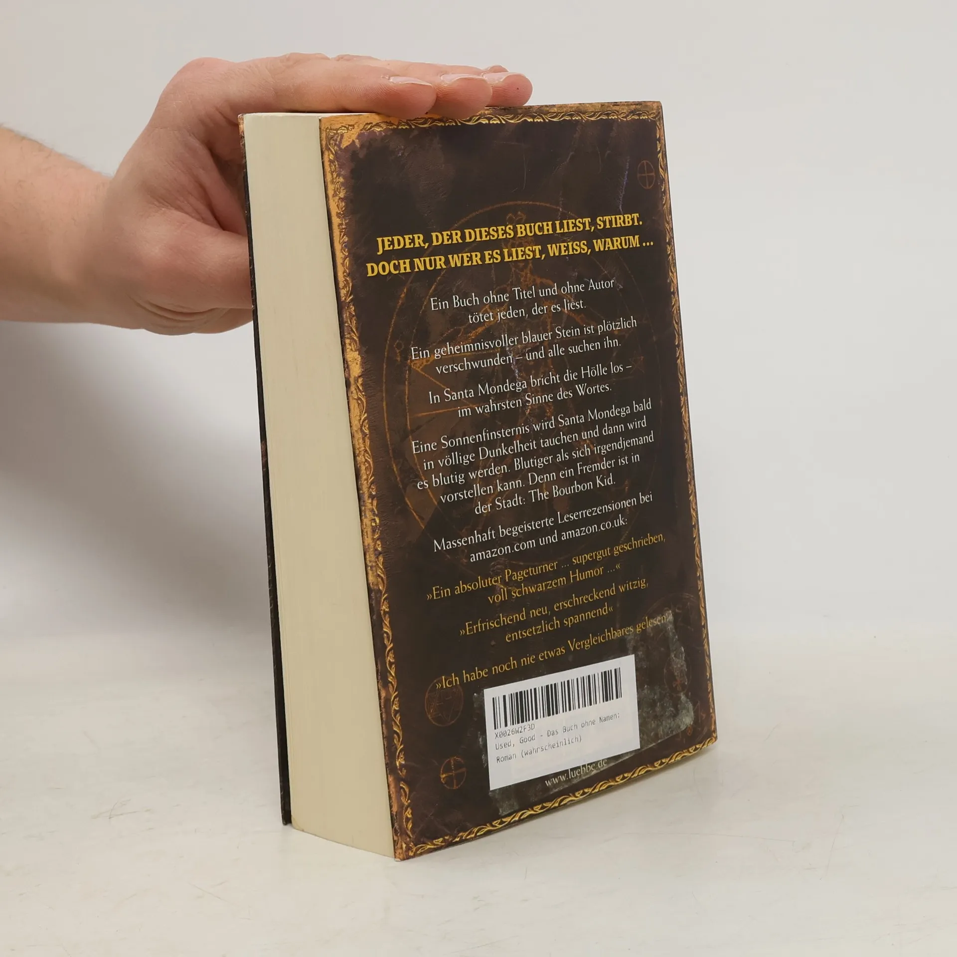 Ein Buch ohne Titel und ohne Autor tötet jeden, der es liest. Ein geheimnisvoller blauer Stein ist plötzlich verschwunden - und alle suchen ihn. In Santa Mondega bricht die Hölle los - im wahrsten Sinne des Wortes. Eine Sonnenfinsternis wird Santa Mondega bald in völlige Dunkelheit tauchen und dann wird es blutig werden. Blutiger als sich irgendjemand vorstellen kann. Denn ein Fremder ist in der Stadt: The Bourbon Kid. Massenhaft begeisterte Leserrezensionen bei amazon. com und amazon. co. uk: „Ein absoluter Pageturner ... supergut geschrieben, voll schwarzem Humor ...“ „Erfrischend neu, erschreckend witzig, entsetzlich spannend“ „Ich habe noch nie etwas Vergleichbares gelesen!“