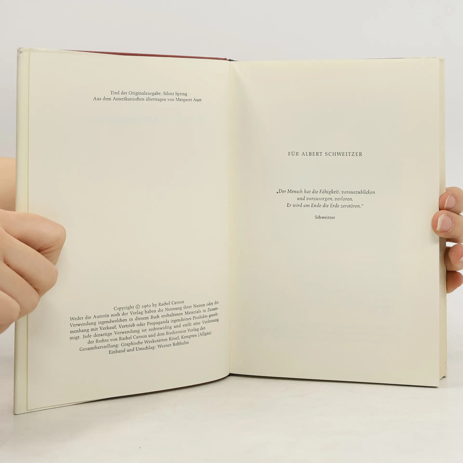 Der stumme Frühling erschien erstmals 1963. Der Titel bezieht sich auf das Märchen von der blühenden Stadt, in der sich eine seltsame, schleichende Seuche ausbreitet. Das spannend geschriebene Sachbuch wirkte bei seinem Erscheinen wie ein Alarmsignal und avancierte rasch zur Bibel der damals entstehenden Ökologie-Bewegung. Zum ersten Mal wurde hier in eindringlichem Appell die Fragwürdigkeit des chemischen Pflanzenschutzes dargelegt. An einer Fülle von Tatsachen machte Rachel Carson seine schädlichen Auswirkungen auf die Natur und die Menschen deutlich. Ihre Warnungen haben seither nichts von ihrer Aktualität verloren.