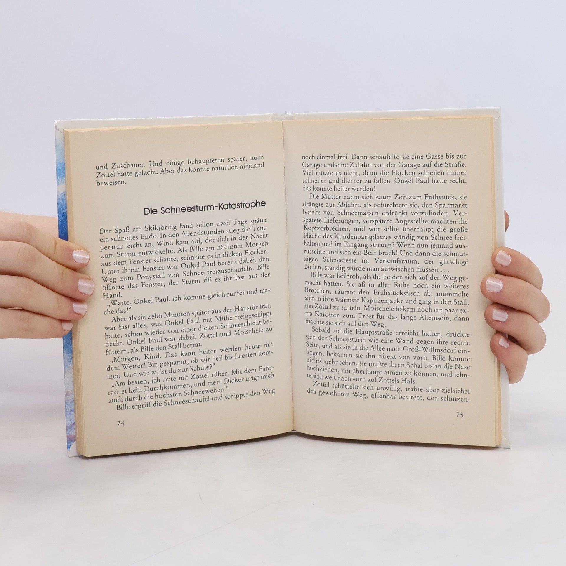 Skijöring! Beim Rennen im Schnee sind auch Bille und ihr rundes Pony Zottel dabei. Beim Startzeichen stürmen die Pferde los. Bille läßt Zottel hangaufwärts laufen, nimmt ihn von der Kurve rechtzeitig zurück, kommt zwar kurz ins Wackeln, fängt sich aber wieder. Auf der Zielgeraden gibt sie dem Pony die Zügel frei, und Zottel donnert die abschüssige Fläche hinunter wie der Leithengst einer Wildpferdherde. Werden Bille und Zottel gewinnen?