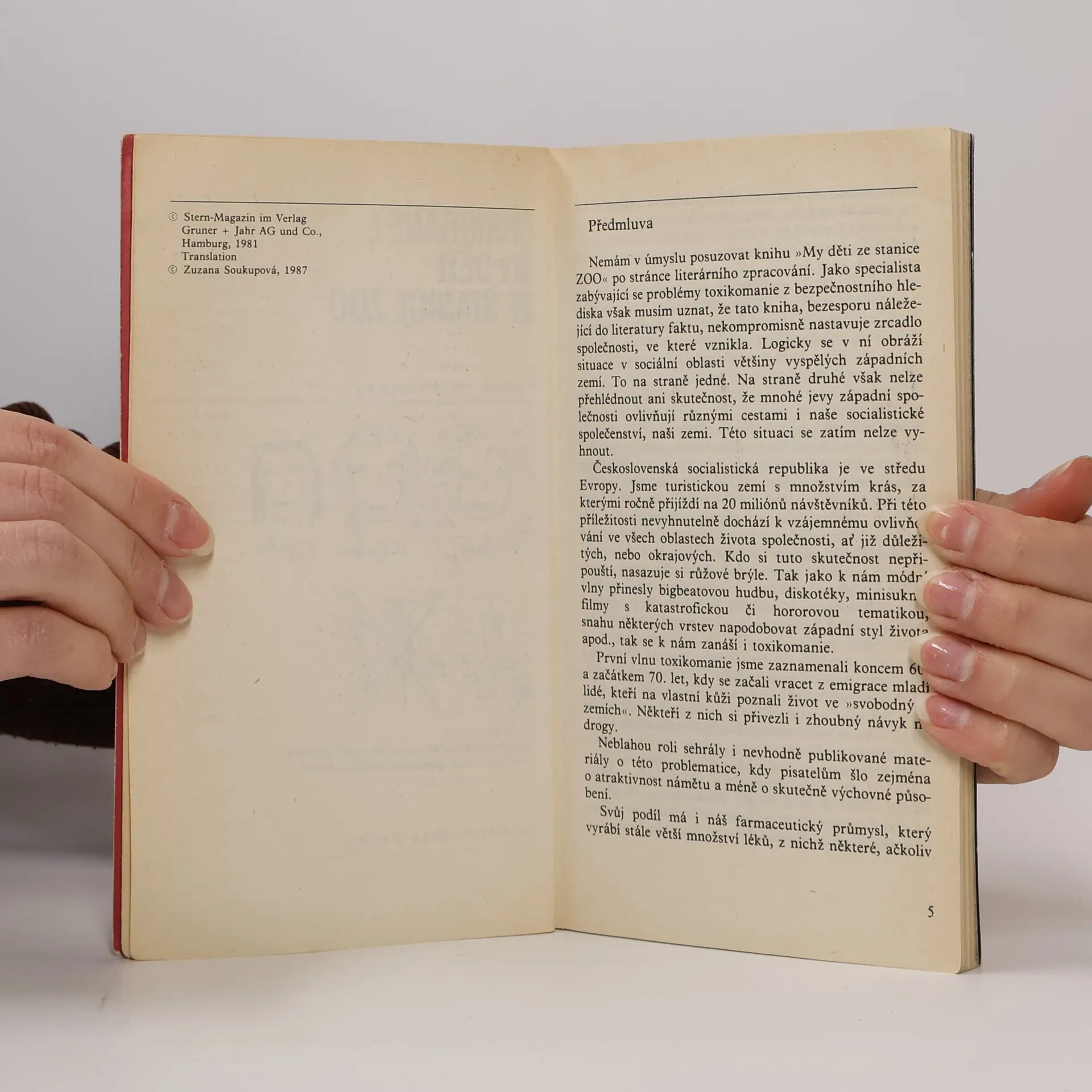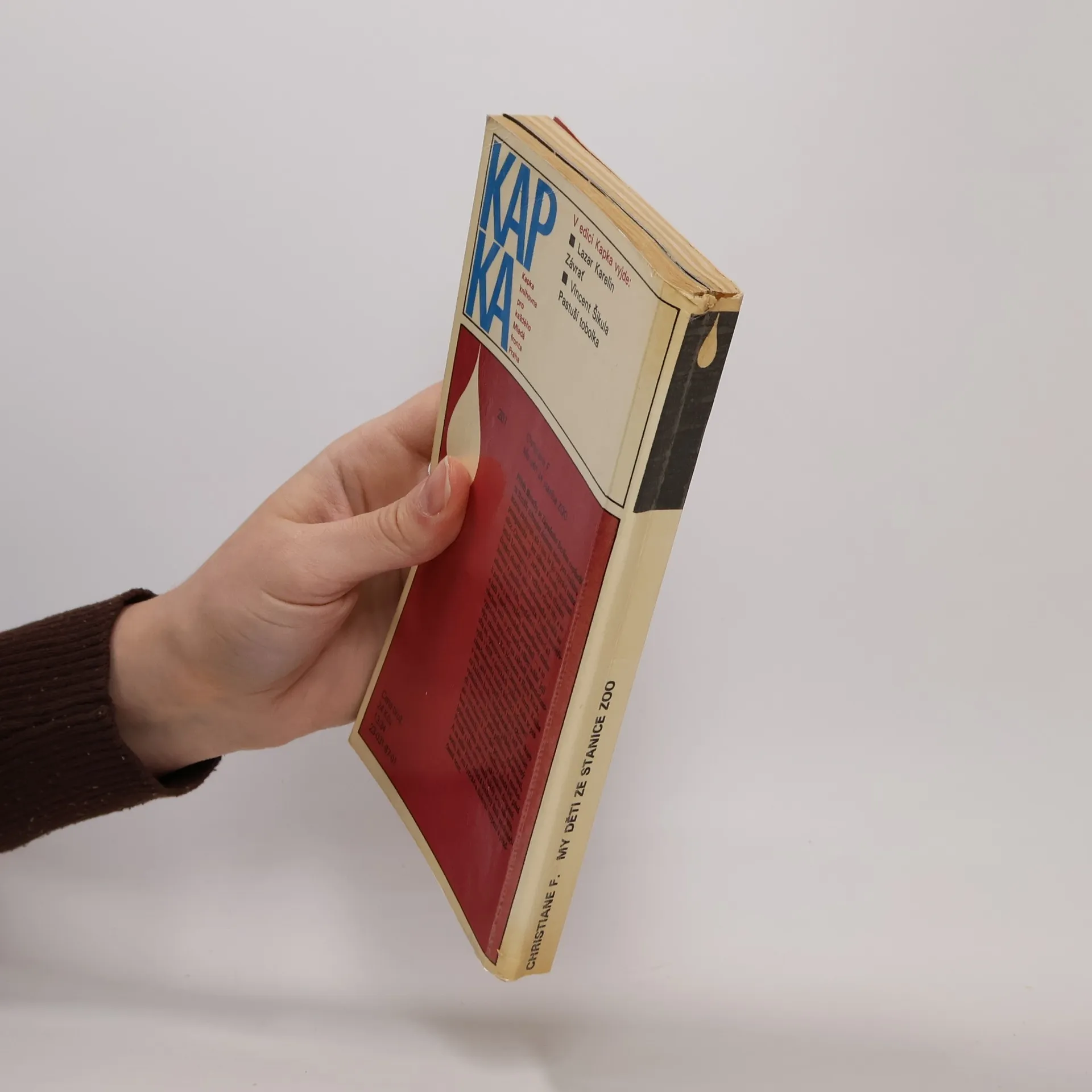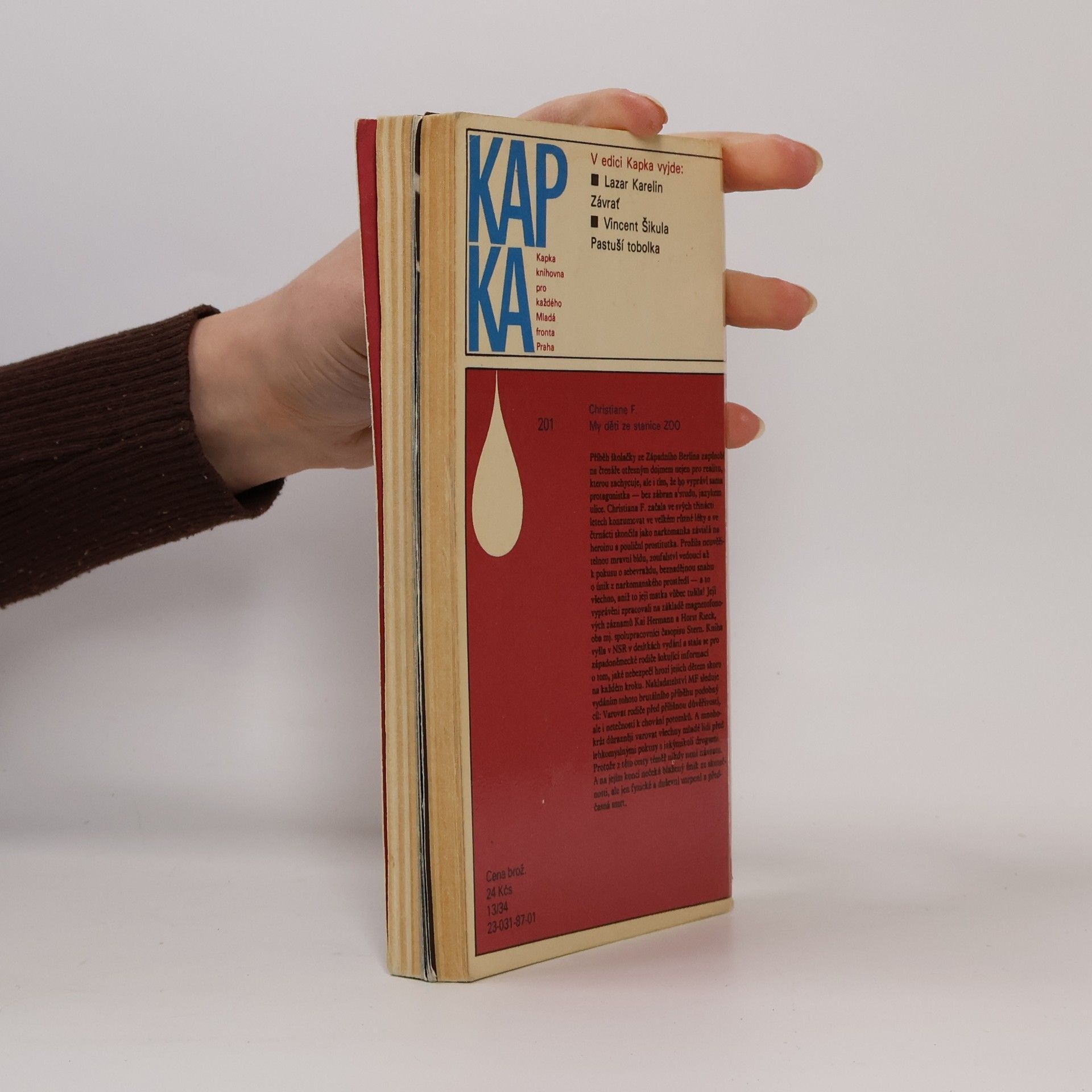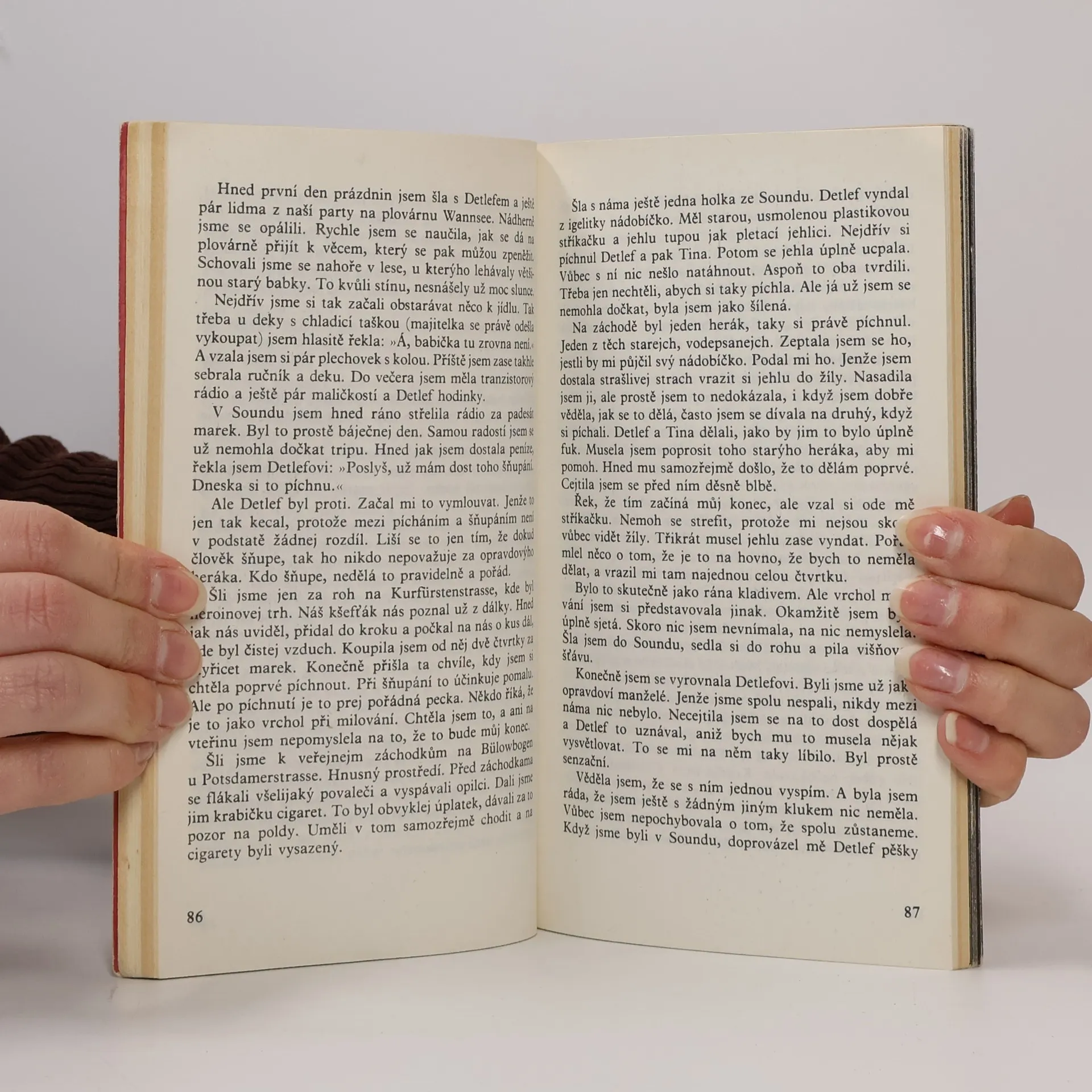 Mladistvá západoberlínská narkomanka ich-formou popisuje svůj příchod jako 6leté na berlínské sídliště Gropiusstadt s minimem možností zábavy pro děti. Neutěšené rodinné poměry vedoucí k rozvodu rodičů ji přivádí k hašišové partě v „Domě středu“. Následně postupně propadává světem drog až k těžké závislosti na heroinu a všemu, co s ní souvisí: těžké zhoršování zdravotního stavu, snaha opatřit si peníze na dávku (žebrání, krádeže, prostituce) a občasné zoufalé a neúspěšné pokusy zbavit se závislosti. Později se dívka závislosti na heroinu zbaví, ale pořád zůstává závislá na hašiši. Kniha obsahuje vlepenou 32 stránkovou fotografickou přílohu. Předmluvu napsal JUDr. Kamil Klášterský. Odborně lektorovali MUDr. Jan Cimický, CSc., JUDr. Kamil Klášterský a MUDr. Jaromír Rubeš. První vydání.
