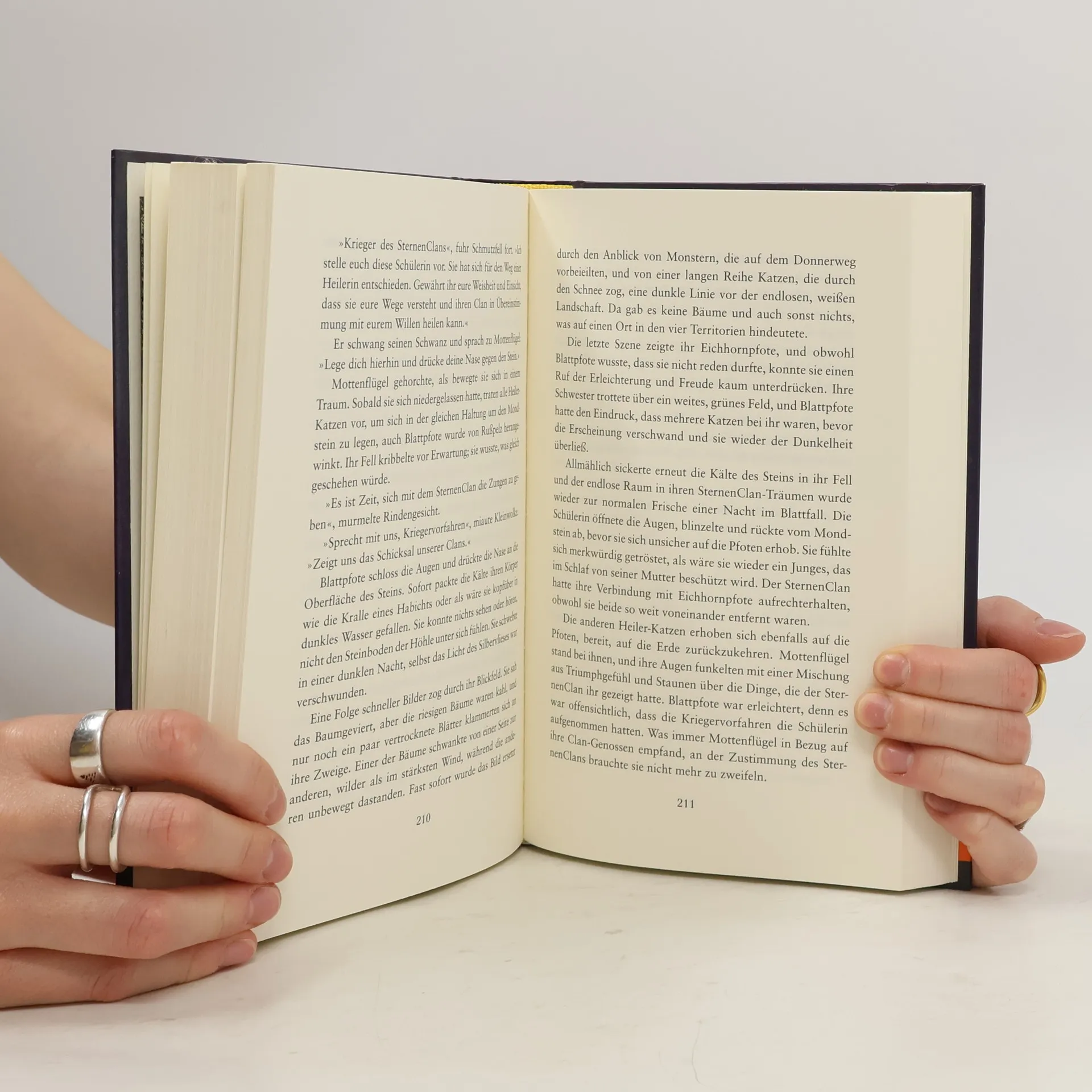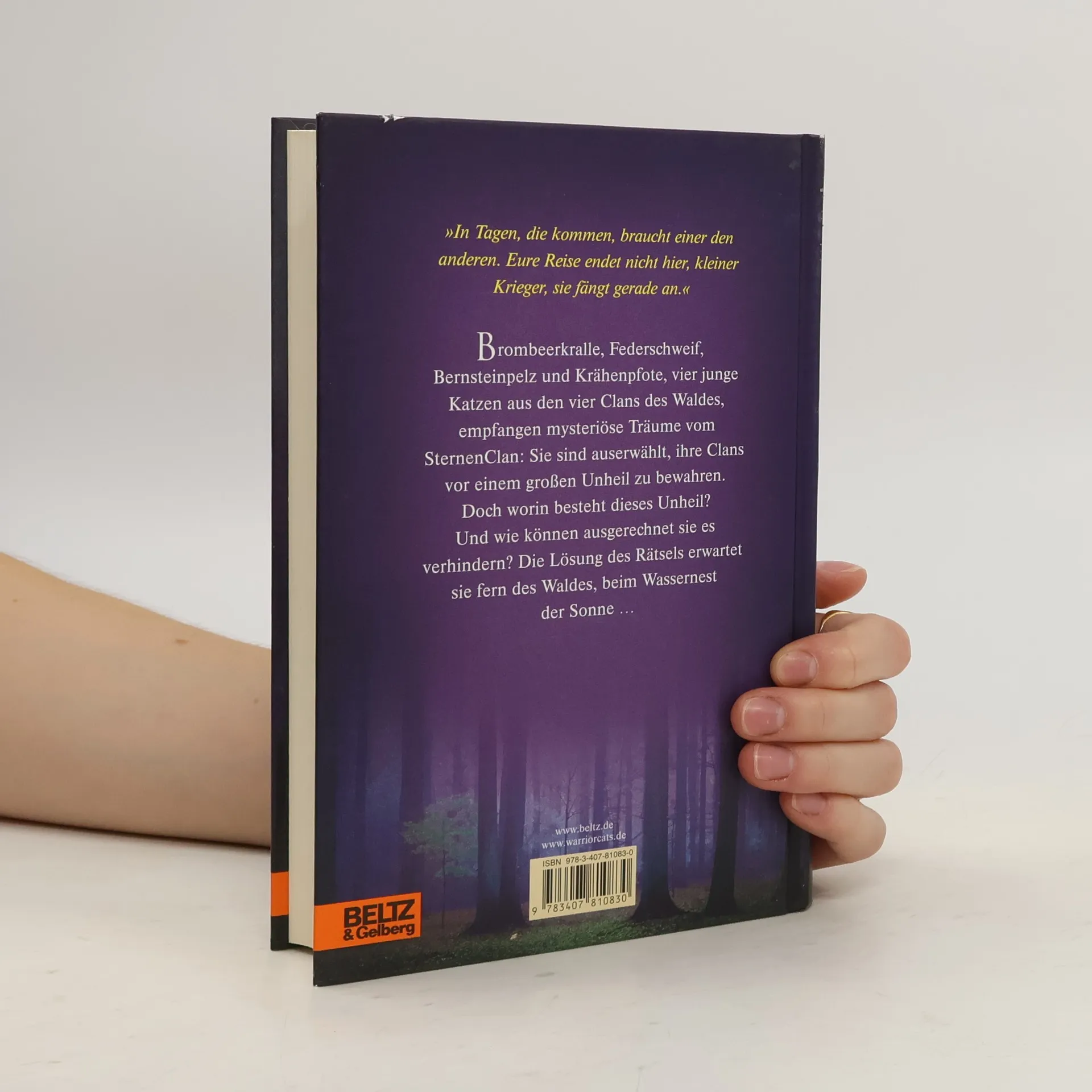 Die neue Prophezeiung: »Finsternis, Luft, Wasser und Himmel werden zusammentreffen... und den Wald bis in seine Wurzeln erschüttern.« »In Tagen, die kommen, braucht einer den anderen. Eure Reise endet nicht hier, kleiner Krieger, sie fängt gerade an.« Brombeerkralle, Federschweif, Bernsteinpelz und Krähenpfote, vier junge Katzen aus den vier Clans des Waldes empfangen mysteriöse Träume vom SternenClan: Sie sind auserwählt, ihre Clans vor einem großen Unheil zu bewahren. Doch worin besteht dieses Unheil? Und wie können ausgerechnet sie es verhindern? Die Lösung des Rätsels erwartet sie fern des Waldes, beim Wassernest der Sonne...