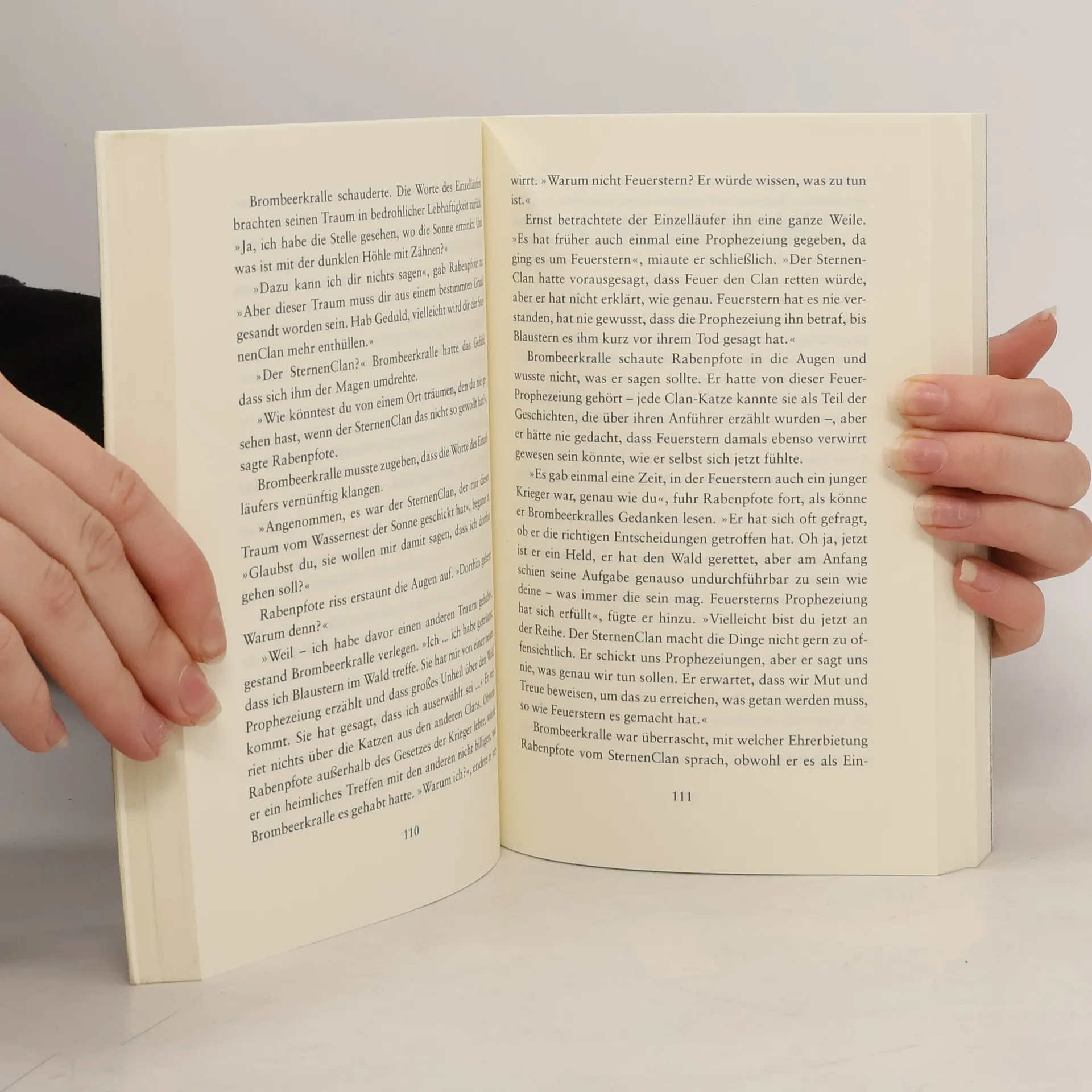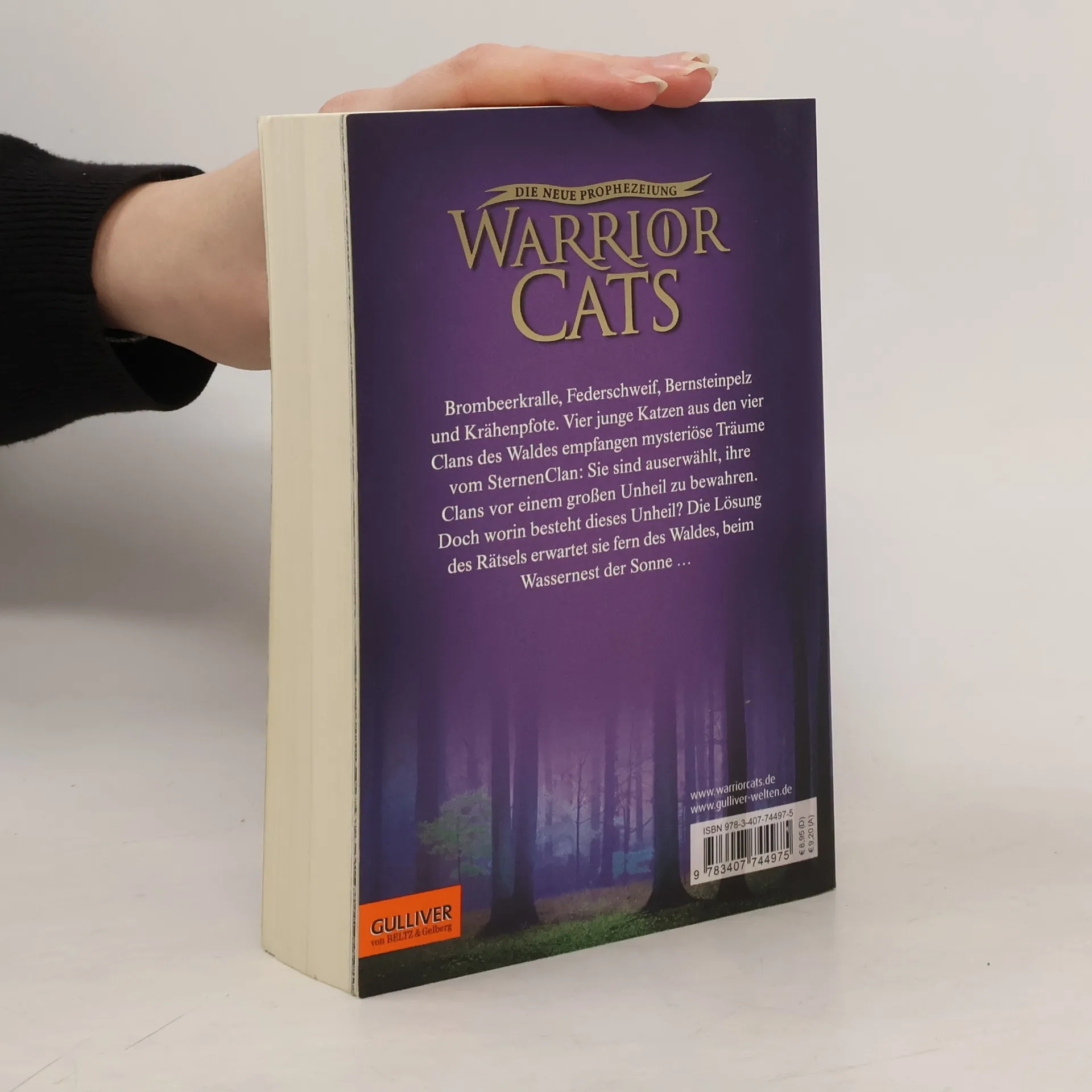 Die neue Prophezeiung: »Finsternis, Luft, Wasser und Himmel werden zusammentreffen... und den Wald bis in seine Wurzeln erschüttern.« »In Tagen, die kommen, braucht einer den anderen. Eure Reise endet nicht hier, kleiner Krieger, sie fängt gerade an.« Brombeerkralle, Federschweif, Bernsteinpelz und Krähenpfote, vier junge Katzen aus den vier Clans des Waldes empfangen mysteriöse Träume vom SternenClan: Sie sind auserwählt, ihre Clans vor einem großen Unheil zu bewahren. Doch worin besteht dieses Unheil? Und wie können ausgerechnet sie es verhindern? Die Lösung des Rätsels erwartet sie fern des Waldes, beim Wassernest der Sonne...