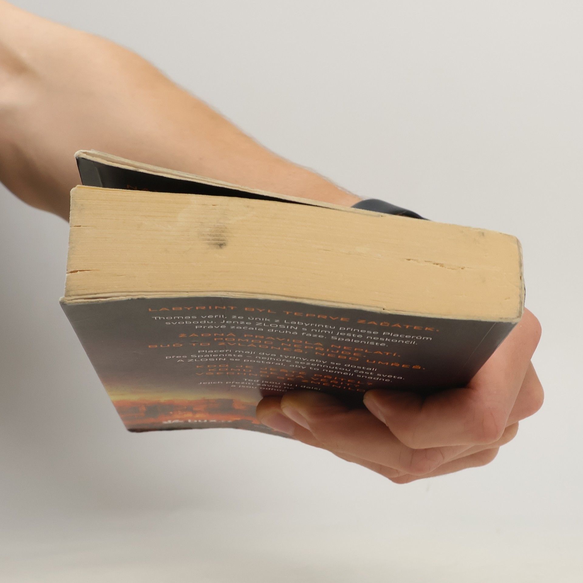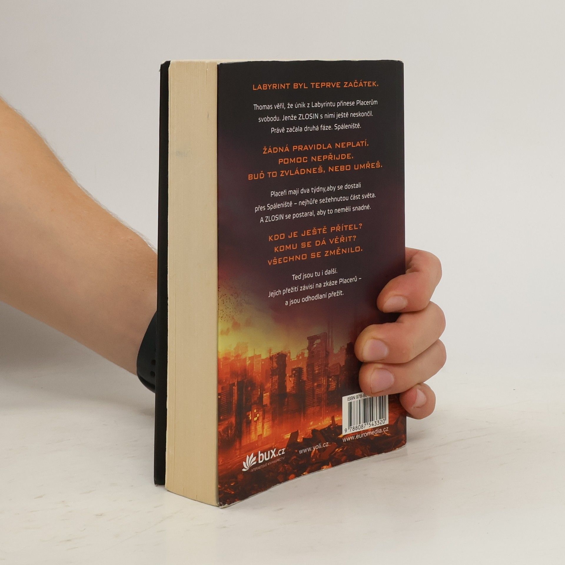 Labyrint byl teprve začátek. Nalezením cesty z labyrintu to mělo skončit... Už žádné hlavolamy. Žádné proměnné. A žádné běhání. Thomas byl přesvědčený, že když se jim podařilo uniknout, vrátí se on i Placeři ke svým dřívějším životům. Nikdo však ve skutečnosti netušil, do jakého života se vracejí. Země, sežehnutá slunečními erupcemi a spálená novým, krutým klimatem, se změnila v pustinu. Vláda se zhroutila – a s ní i pořádek. Rozpadajícími se městy teď bloudí „raplové“, lidé pokrytí hnisavými ranami, které infekční nemoc nazývaná erupce dohání k vražednému šílenství. Hledají, kde by našli další oběť... a potravu. Pro Placery běhání zdaleka neskončilo. Namísto svobody zjišťují, že mají před sebou další zkoušku. Musejí překonat Spáleniště, nejvíc sežehnutou část planety, a do dvou týdnů dorazit do bezpečného útočiště. A organizace ZLOSIN se postarala o to, aby uzpůsobila proměnné a nastavila šance v jejich neprospěch. Thomase čeká zkouška ohněm – skutečně přechovává někde v hlavě tajemství svobody? Nebo bude věčně vydán ZLOSINu na milost?