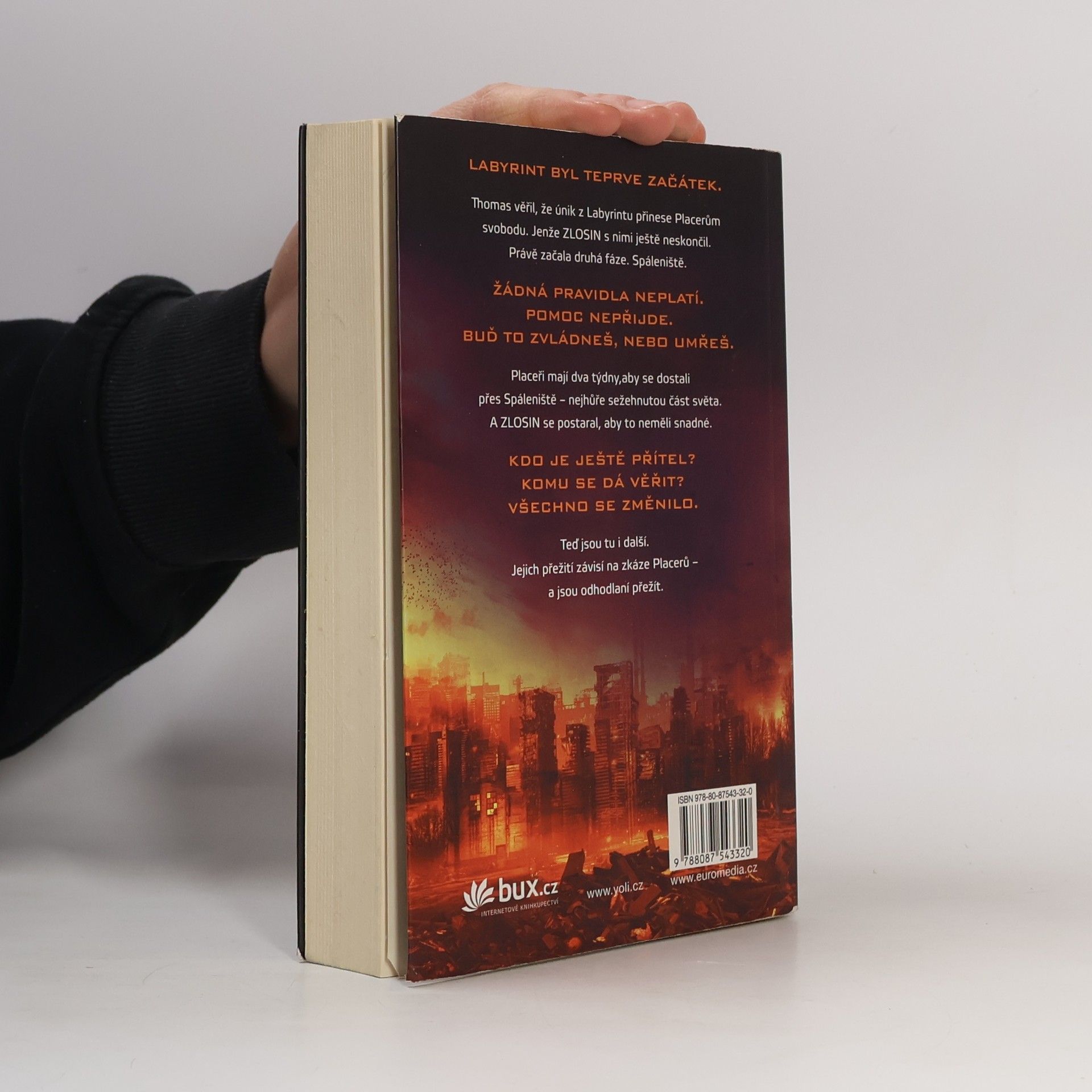 Labyrint byl teprve začátek. Nalezením cesty z labyrintu to mělo skončit... Už žádné hlavolamy. Žádné proměnné. A žádné běhání. Thomas byl přesvědčený, že když se jim podařilo uniknout, vrátí se on i Placeři ke svým dřívějším životům. Nikdo však ve skutečnosti netušil, do jakého života se vracejí. Země, sežehnutá slunečními erupcemi a spálená novým, krutým klimatem, se změnila v pustinu. Vláda se zhroutila – a s ní i pořádek. Rozpadajícími se městy teď bloudí „raplové“, lidé pokrytí hnisavými ranami, které infekční nemoc nazývaná erupce dohání k vražednému šílenství. Hledají, kde by našli další oběť... a potravu. Pro Placery běhání zdaleka neskončilo. Namísto svobody zjišťují, že mají před sebou další zkoušku. Musejí překonat Spáleniště, nejvíc sežehnutou část planety, a do dvou týdnů dorazit do bezpečného útočiště. A organizace ZLOSIN se postarala o to, aby uzpůsobila proměnné a nastavila šance v jejich neprospěch. Thomase čeká zkouška ohněm – skutečně přechovává někde v hlavě tajemství svobody? Nebo bude věčně vydán ZLOSINu na milost?