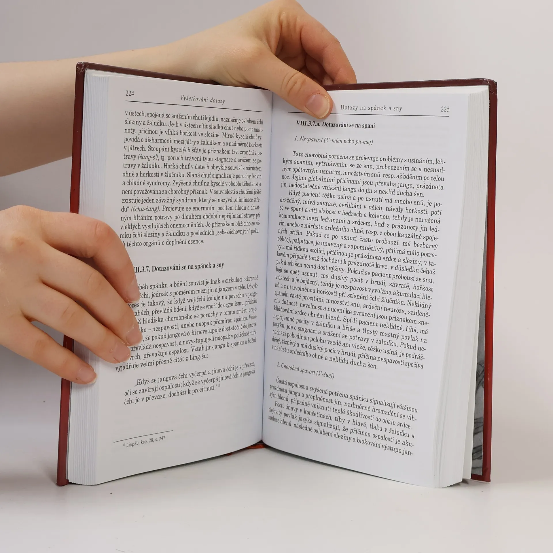 Čtvrtý díl cyklu o čínské medicíně se zaměřuje na metody vyšetřování. Obsahuje techniky vyšetření zrakem, čichem, dotazy a pohmatem. KAPITOLA VIII – METODY VYŠETŘOVÁNÍ zahrnuje: - **Vyšetřování zrakem**: Pozorování ducha šen, jeho stavy a poruchy, emoční poruchy, barvy obličeje a jejich vztah k cang-fu, zdravý a chorobný vzhled, a pozorování jednotlivých částí těla včetně hlavy, očí, nosu, úst, zubů, hrdla, hrudníku, břicha, zad, končetin a pokožky. Dále se zaměřuje na jazyk a jeho povlak, výměšky, hleny, sliny, zvratky, stolici a moč. - **Vyšetřování sluchem a čichem**: Naslouchání hlasu, řeči, dýchání, kašli, kýchání a dalším tělesným zvukům. - **Vyšetřování dotazy**: Zahrnuje otázky o teplotě, pocení, bolesti, a specifické dotazy na jednotlivé části těla, jako jsou hlava, hrdlo, hrudník, břicho a končetiny. Dále se dotazuje na trávení, spánek a vyměšování. - **Vyšetřování pohmatem**: Zahrnuje pohmat pulzu, jeho zdravé a chorobné varianty, a pohmat těla, včetně končetin a hrudníku. DODATKY obsahují rejstřík čínských slov.