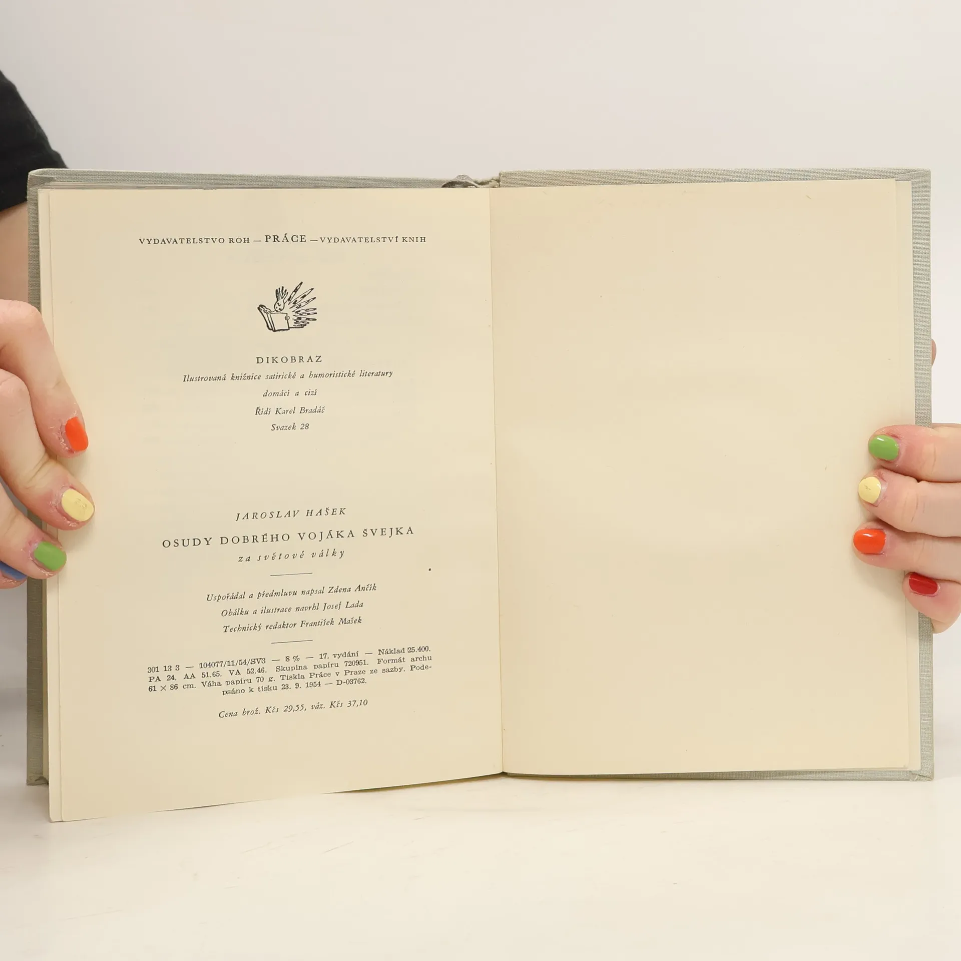 Kuriosní vydání Haškova slavného románu z roku 1954 , jen pro příslušníky čs. branné moci. Čtyři díly: V zázemí, Na frontě, Slavný výprask, Pokračování slavného výprasku. Ilustrace Josef Lada. Rozsáhlé vydavatelské vysvětlivky.