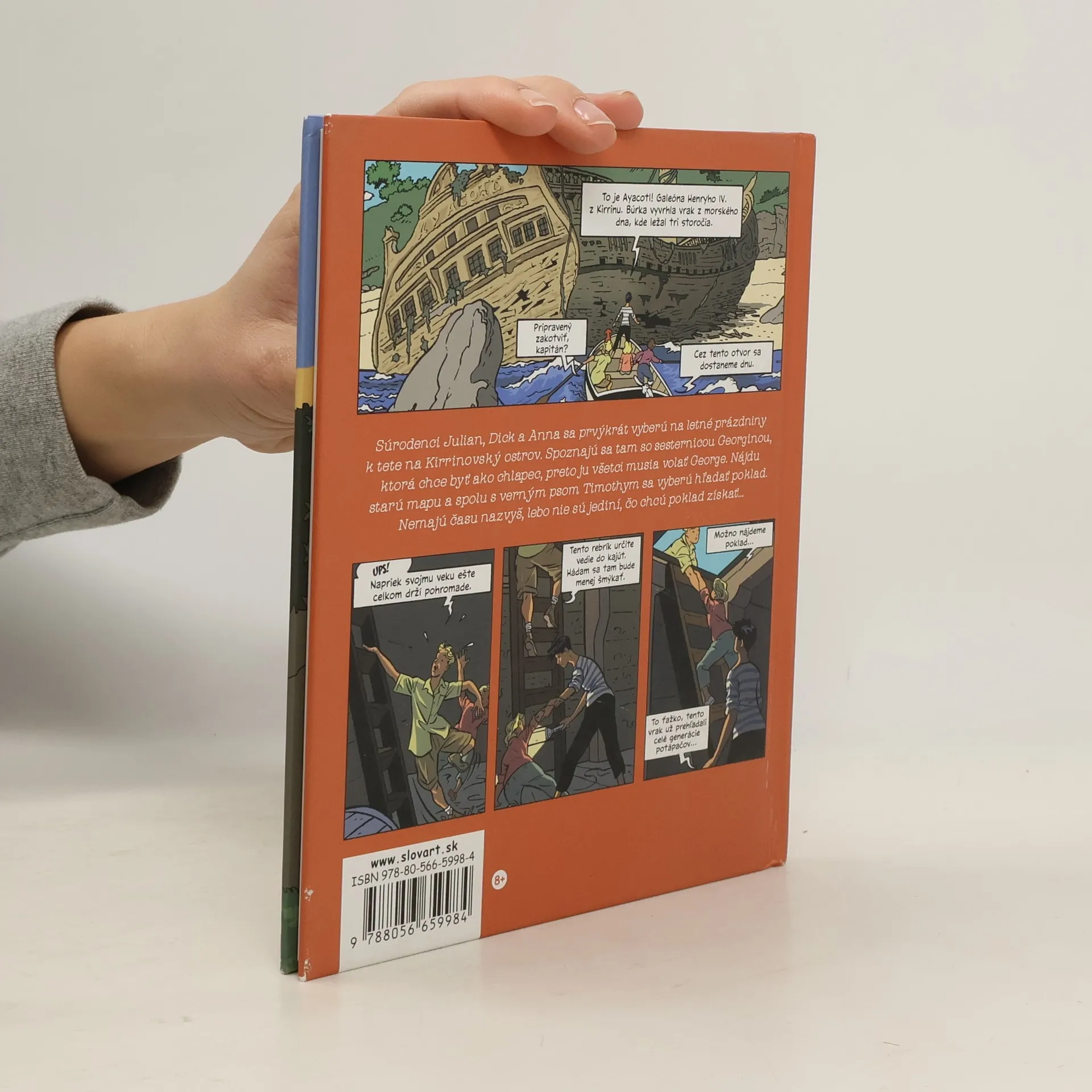 Obľúbená dobrodružná séria pre malých i veľkých tentoraz vo forme komiksu!Slávna päťka, to sú v skutočnosti štyri deti a pes. Julian, Dick, George, či vlastne Georgina, Anna a pes Timothy. Čo všetko zažili na pustom ostrove? Aké dobrodružstvo ich postretlo pri plavbe na mori či v noci v zrúcanine starého hradu? Čo objavili v starom potopenom vraku? A ako vyzerá ozajstné hľadanie pokladu?