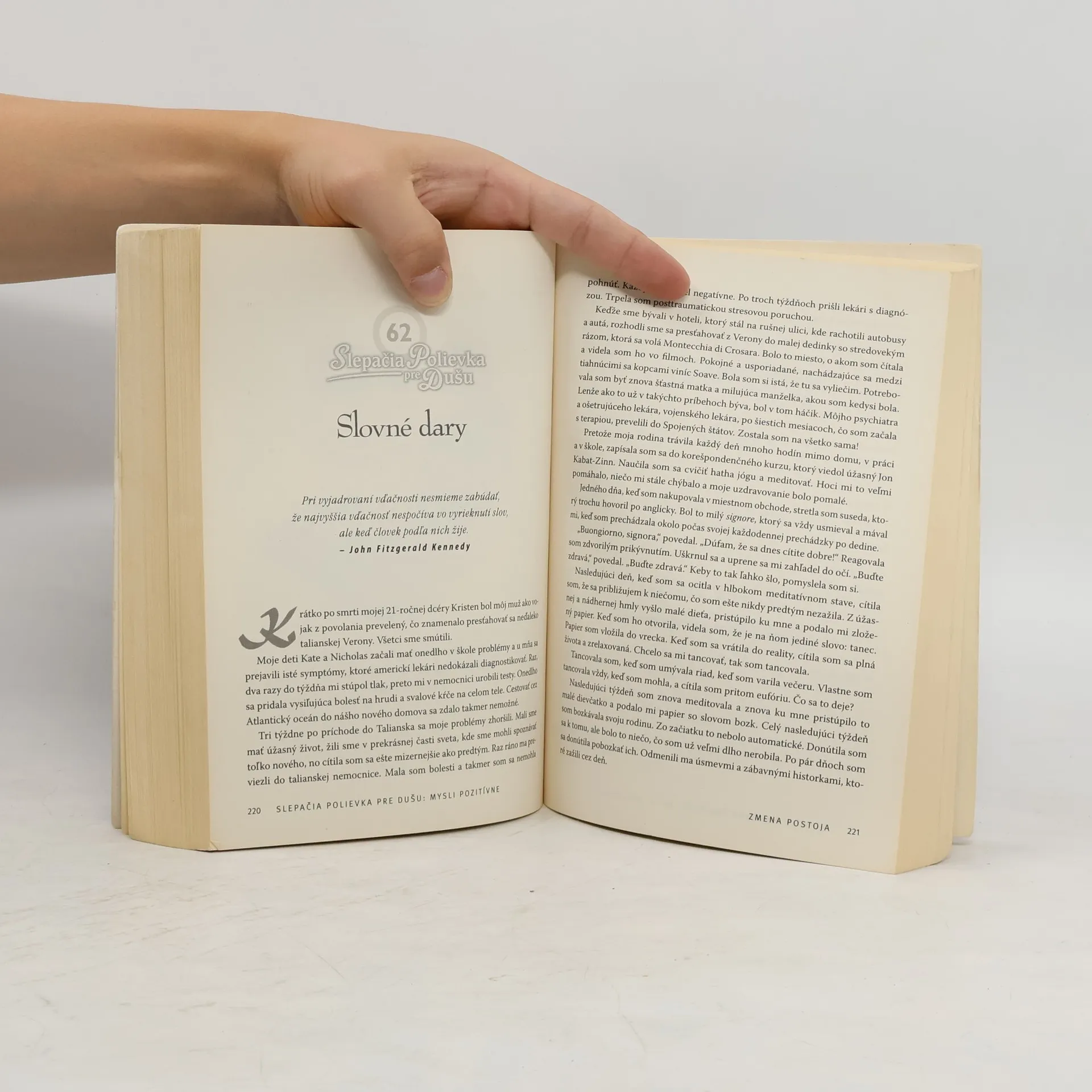 Potrebujete „postrčiť“? Každý potrebuje z času na čas povzbudiť či motivovať. Tieto inšpiratívne príbehy, ktoré sa skutočne stali, vám v tom pomôžu. Nedávne vedecké štúdie dokázali, že vďační, pozitívni ľudia vedú lepší život, aj z najzložitejších situácií sa zotavujú ľahšie, sú zdravší, aktívnejší, produktívnejší, problémy riešia rýchlejšie a správnejšie – a ostatní ich vnímajú s väčšou úctou. Deti s pozitívnymi spomienkami dosahujú v škole lepšie výsledky. Ale ako sa ponoriť do pozitívnych spomienok, keď prežívate niečo skutočne ťažké? Vtedy vám ošúchané rady zvyčajne nepomôžu. Táto kniha však áno. Ponúka 101 inšpiratívnych príbehov, plných skúseností, ktoré skutoční ľudia s reálnymi problémami zažívajú každý deň, a napriek tomu našli vnútornú silu na to, aby sa s výzvami popasovali, prekonali prekážky a našli spôsob, ako prinavrátiť životu zmysel.