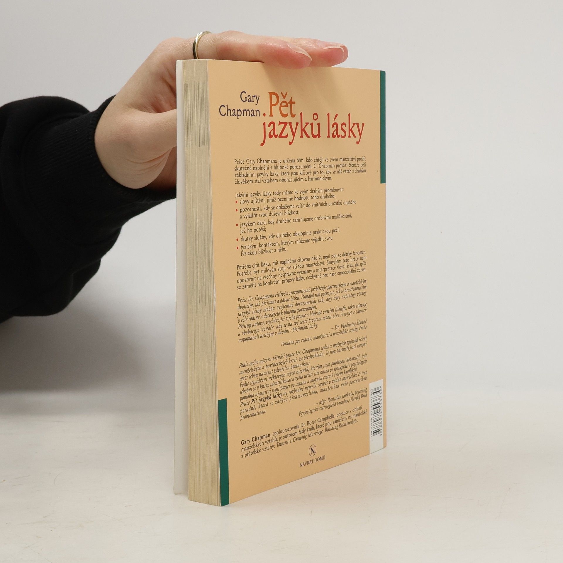 Práce Gary Chapmana je určena těm, kdo chtějí ve svém manželství prožít skutečné naplnění a hluboké porozumění. G. Chapman provází čtenáře pěti základními jazyky lásky, které jsou klíčové pro to, aby se náš vztah s druhým člověkem stal vztahem obohacujícím a harmonickým.