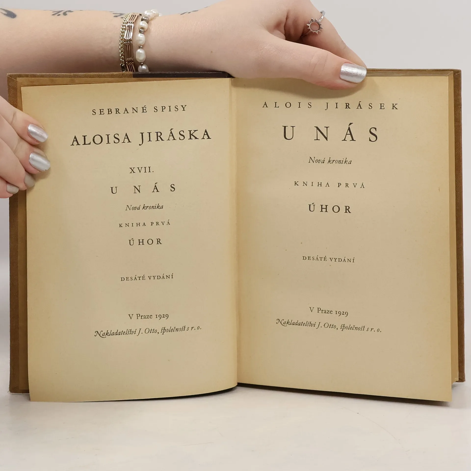 Alois Jirásek: U NÁS. Románová čtyřdílná kronika. Kniha prvá - ÚHOR. Psáno roku 1895 - 1896. Druhé vydání v roce 1926. Nakladatelství J. Otto, spol. s r.o. v Praze, edice: Nová kronika. Tiskem České grafické unie, a.s. v Praze. Vazba celoplátěná nakladatelská s barevným popisem nahřbetu, stužková záložka.