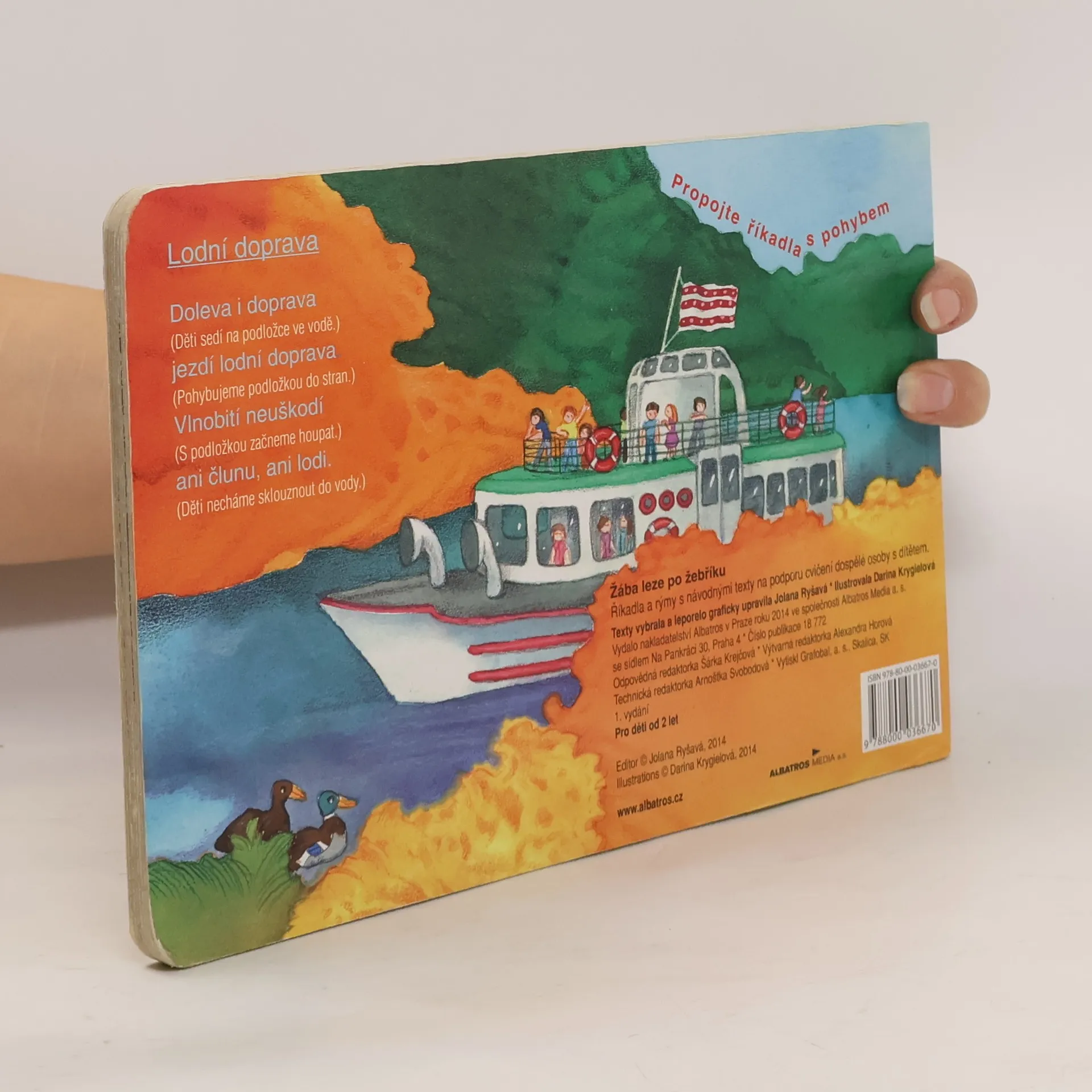 Říkadla a rýmy s návodnými texty na podporu cvičení dospělé osoby s dítětem jsou v leporelu ŽÁBA LEZE PO ŽEBŘÍKU vlastně pokračováním předešlého: na 14 stranách plných půvabných a vtipných barevných obrázků Dariny Krygielové jsou říkadla doplněná texty pro rodiče. Dítě se učí nejen hravé rýmy, ale procvičuje také tělo. Vhodné pro společné chvilky dětí s dospělými.
