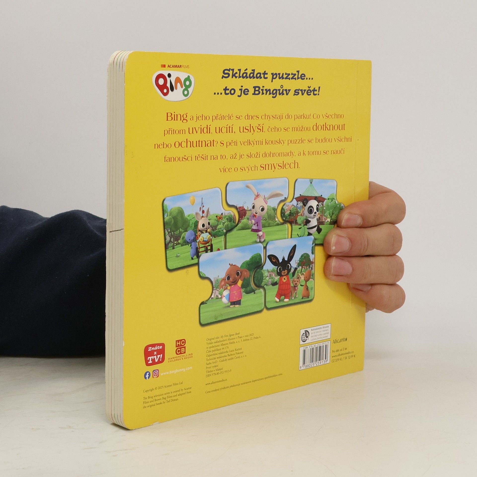 Knížka s pevnými listy a pěti velkými dílky puzzle přináší dětem krátký příběh Binga a jeho kamarádů.